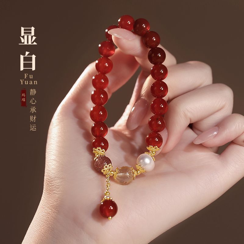 【显白温颜❗️红玛瑙草莓晶珍珠手链】水润温和,色泽靓丽,串珠闺蜜手链新中式气质网本命年淡水手串金发晶