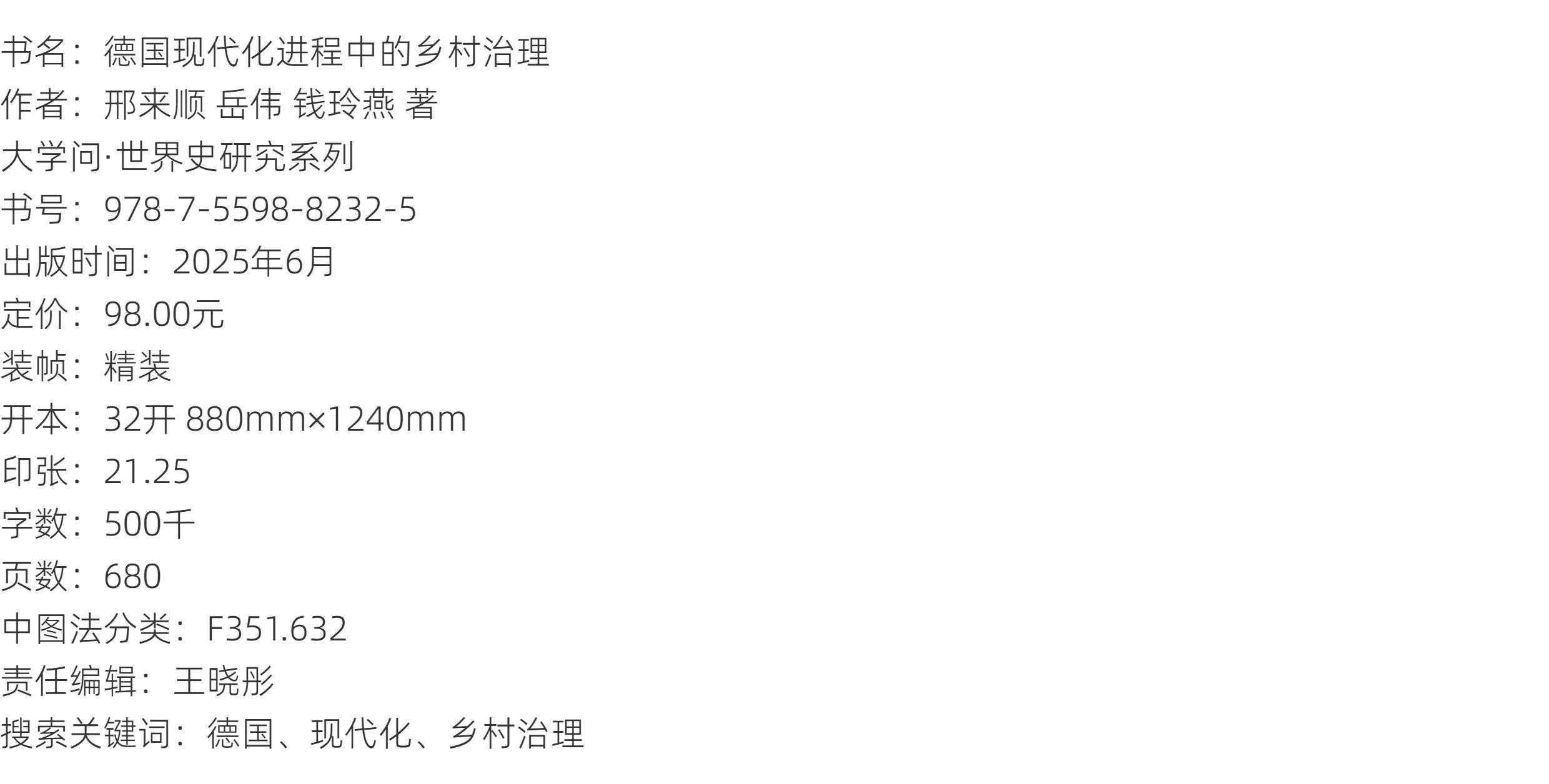 大学问·世界史研究系列 德国现代化进程中的乡村治理 邢来顺、岳伟、钱玲燕/著 德国、现代化、乡村治理