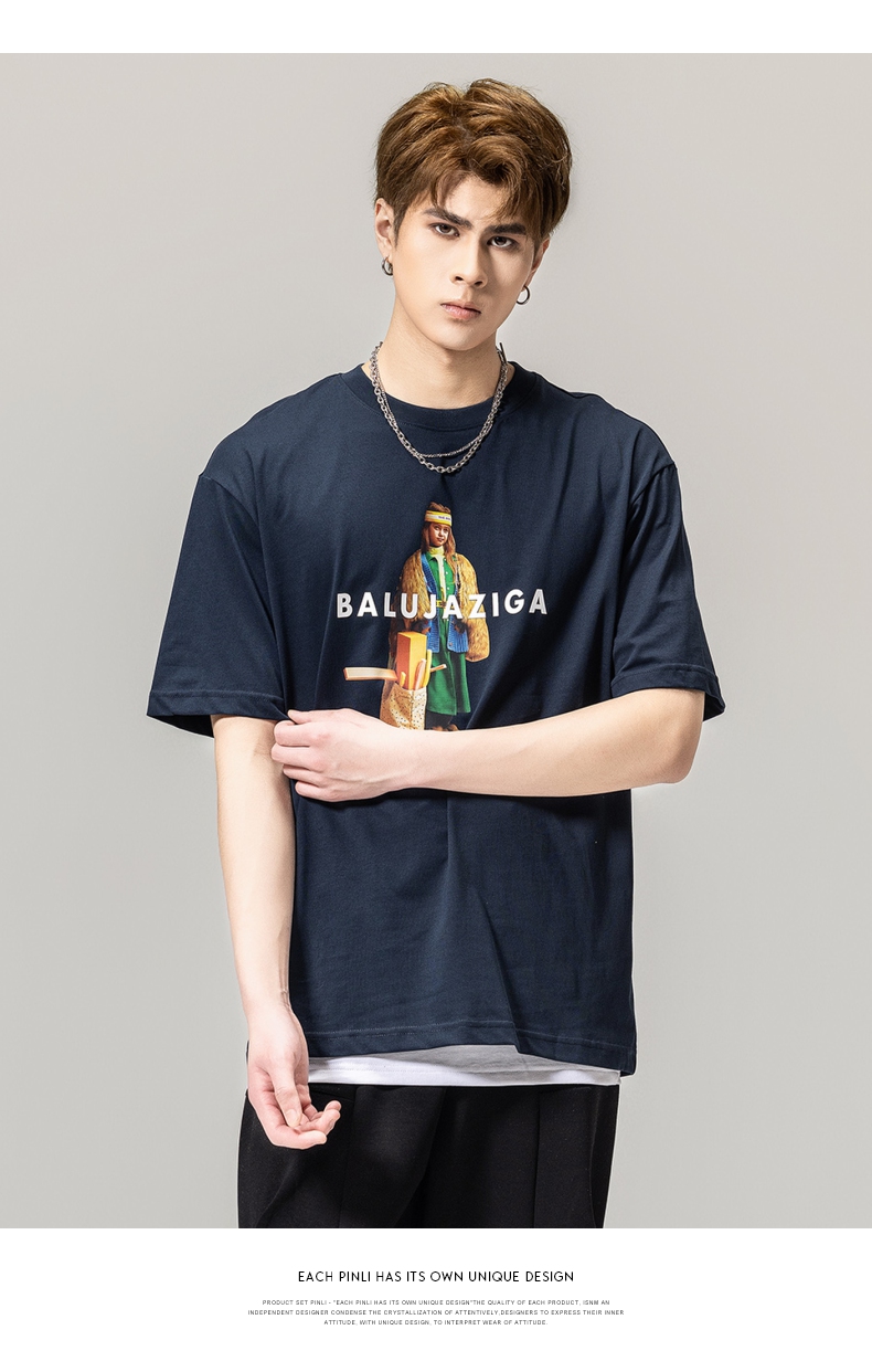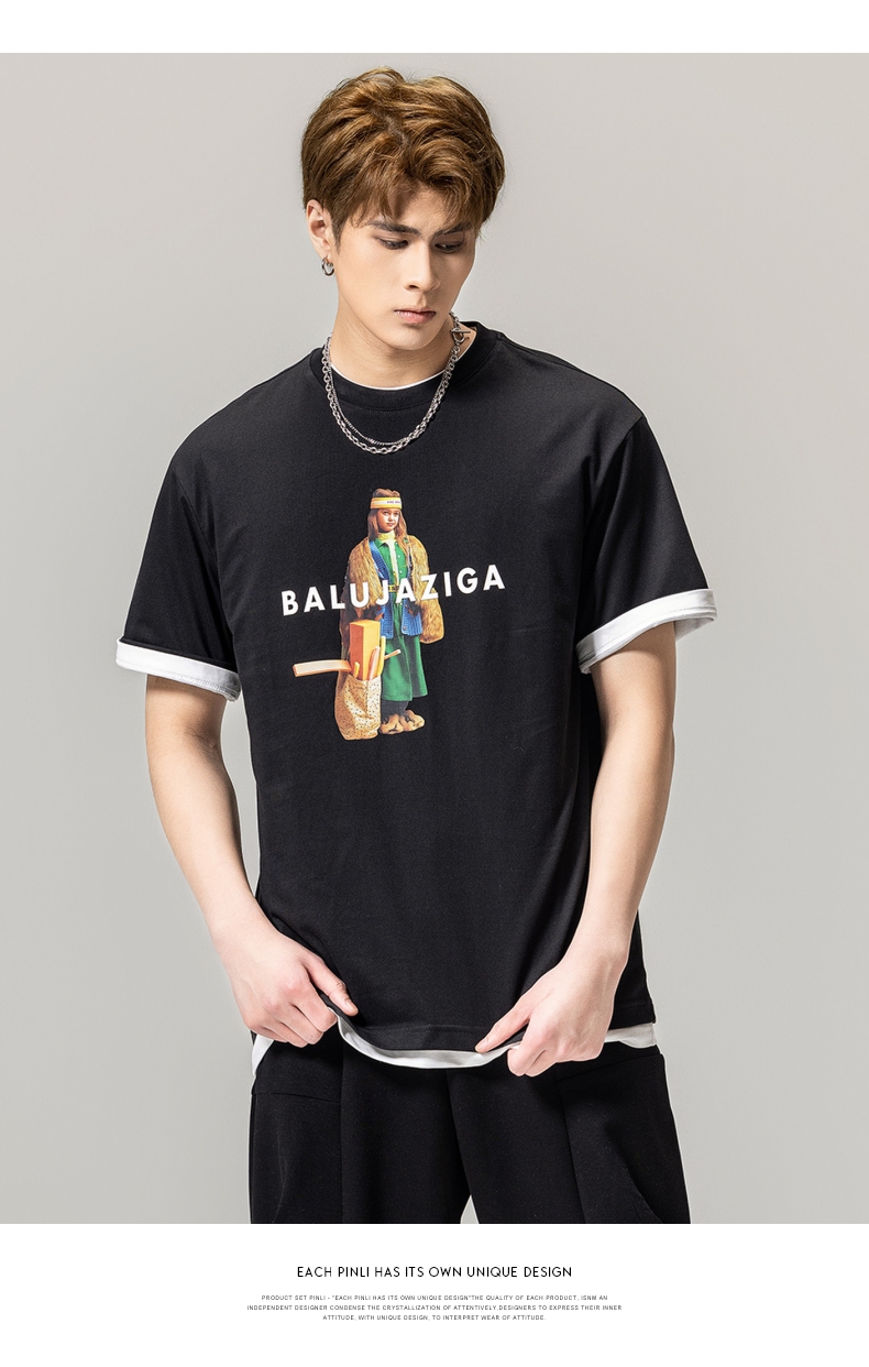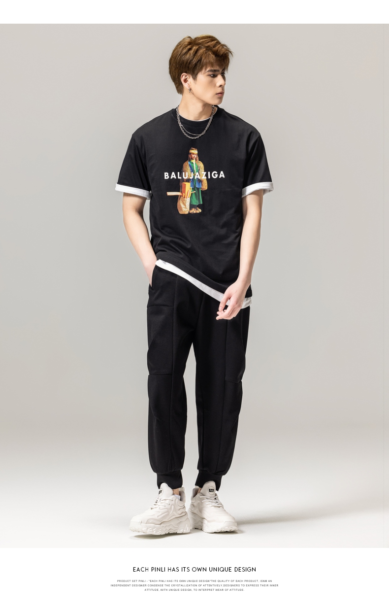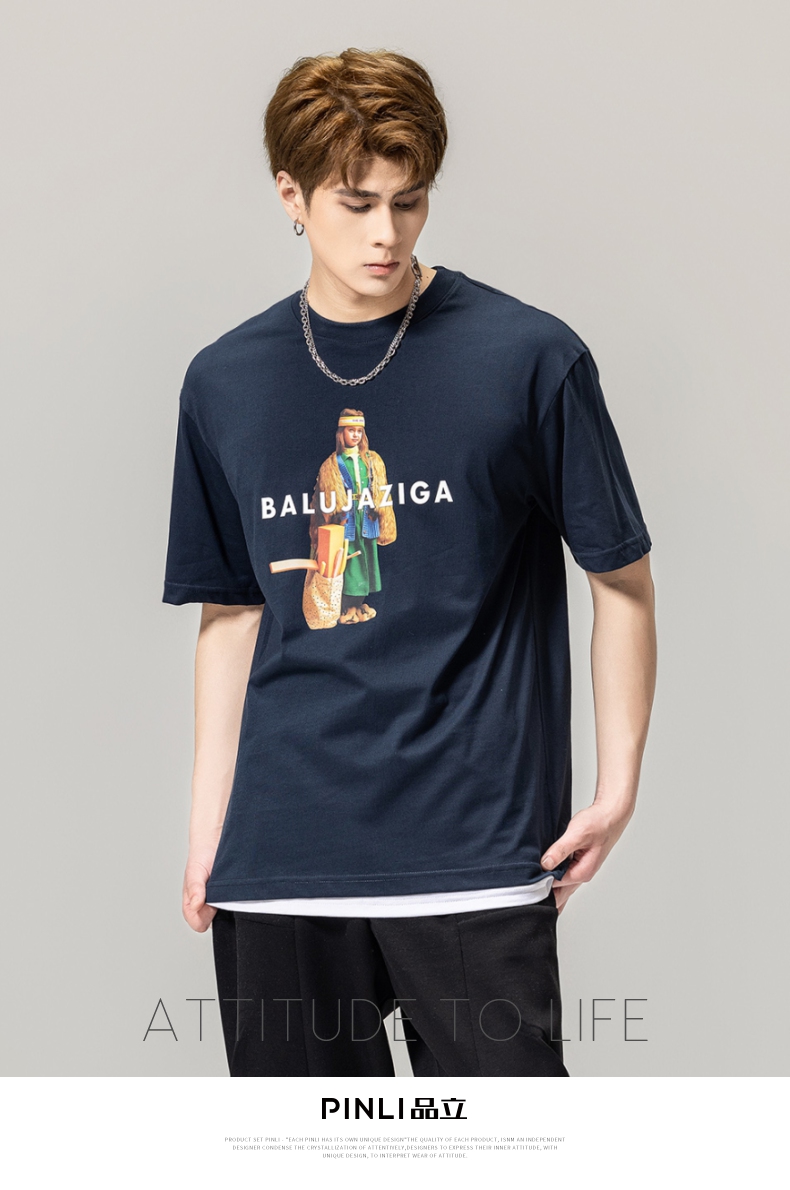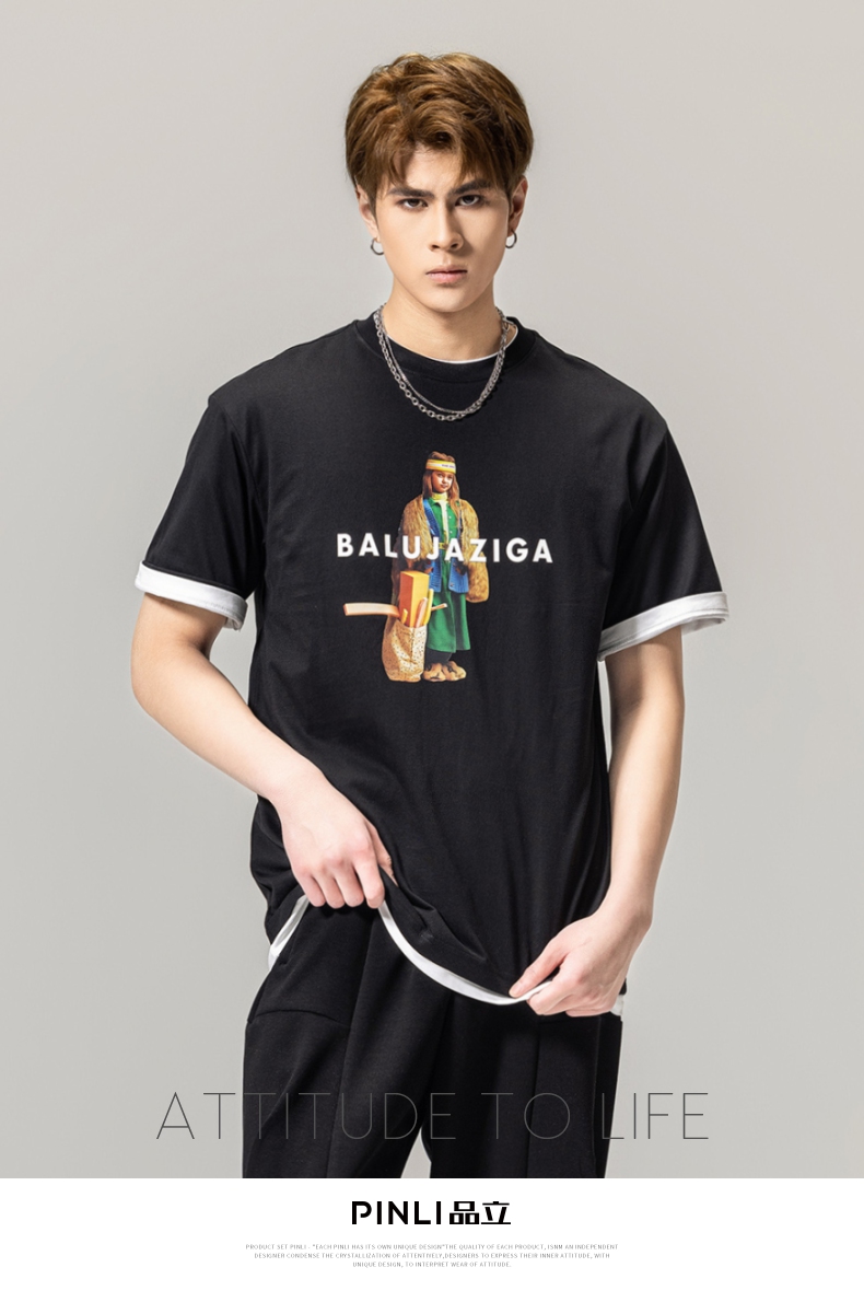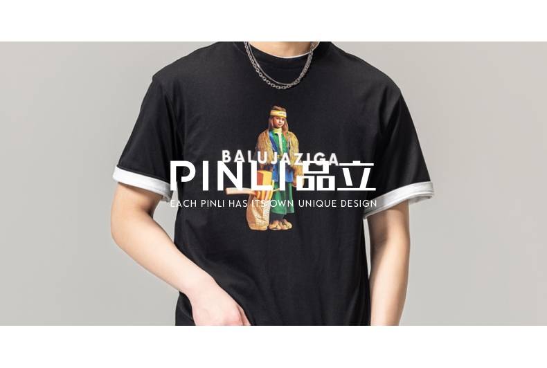 PINLI品立春季新款男士印花T恤圆领短袖体恤潮牌BG231111043