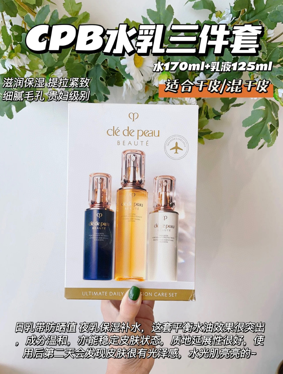 水乳套装,贵妇级别,绝对是越用越爱,慢慢就会感到皮肤的一点点改变,cpb的护肤基础保湿很好。而且 乳液日夜分离 ,专乳专用。日乳含还有防晒效果。