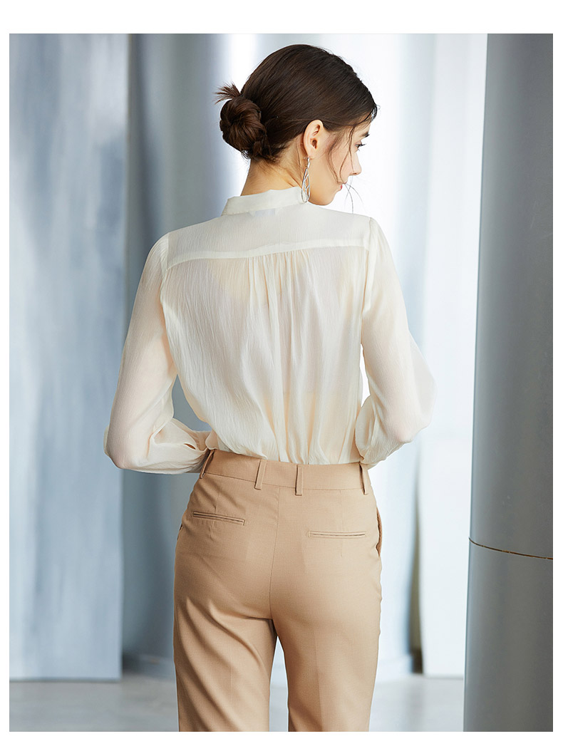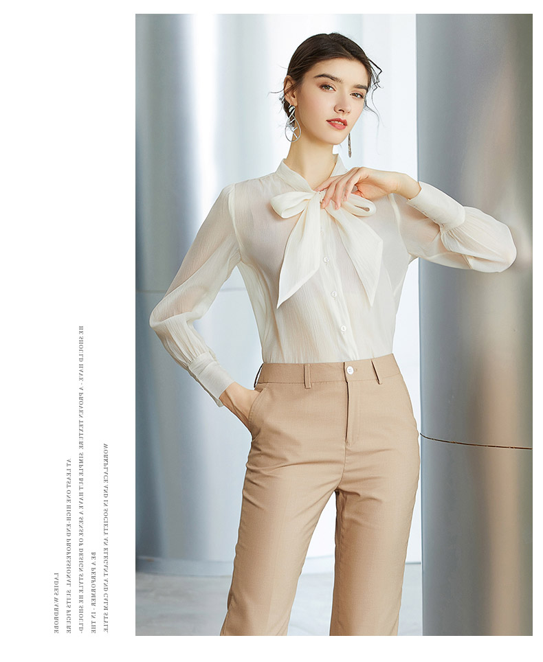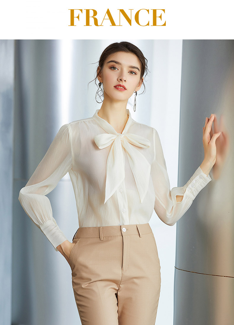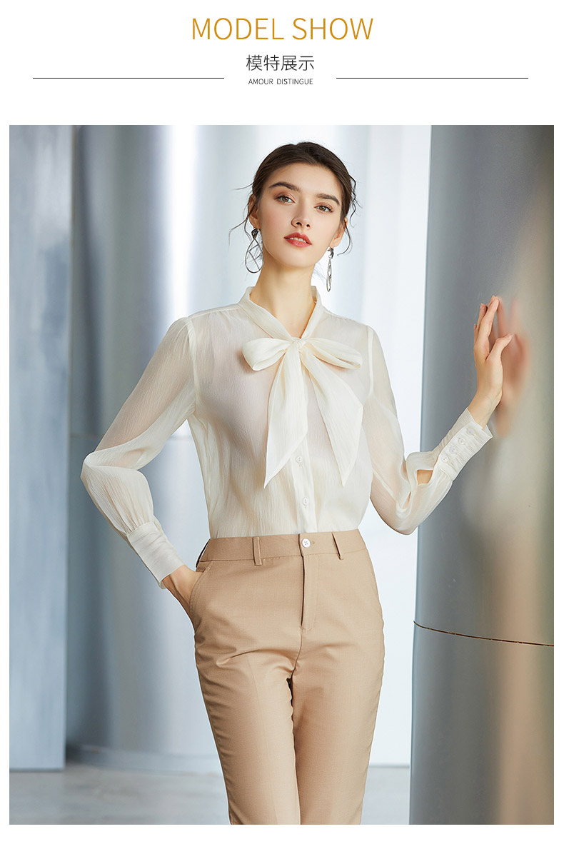 AD春季时尚名媛长袖薄款香槟色衬衫职业装气质女神蝴蝶结系带衬衣