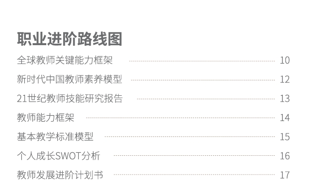 在职业进阶线路部分,手册精选了不同国家教育主管部门对于教师素养的顶层要求,初任教师可结合《个人成长SWOT分析》,进行《进阶计划书》的规划和设计。