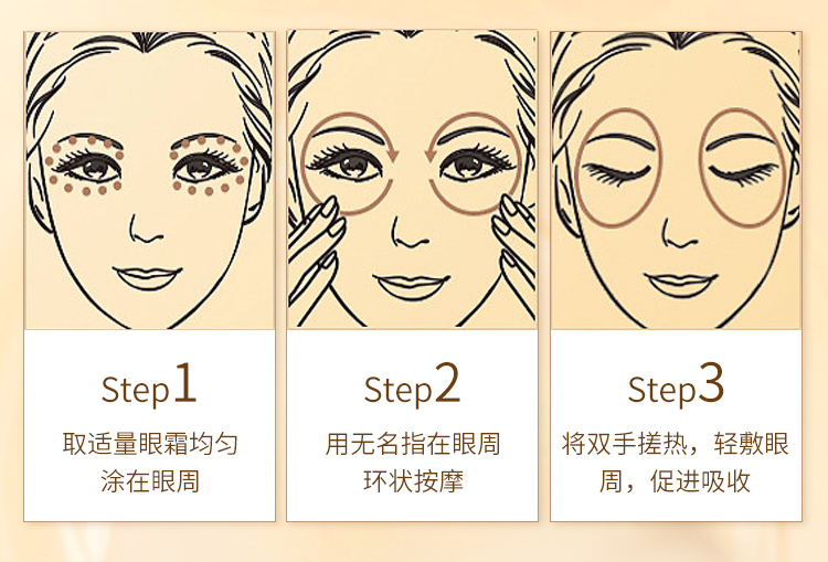 用点涂的方式把膏体均匀涂在眼周,接着用指尖沿着眼周打圈、加快微循环。