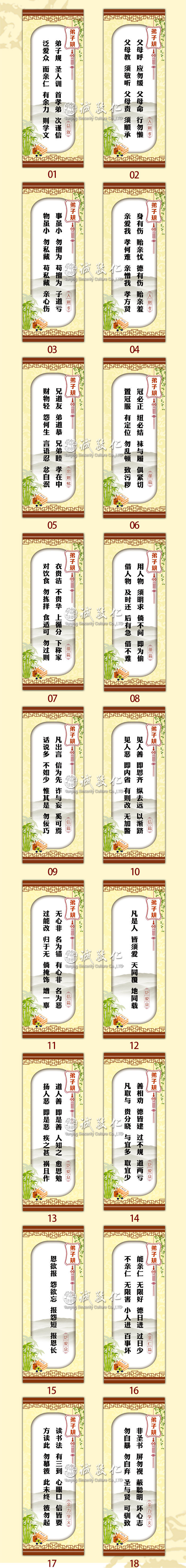【基本信息】: 产品名称:中学教室弟子规挂画(18张/套) 产品规格:35cm*90cm 产品材质:字画材质(PP背胶纸) 产品定价:360元/套[注:一口价为整套价格,不单卖。] 【PP背胶纸】: 属于塑料合成纸,表面防水,防尘,可擦洗,光洁度高,色彩还原性好,持久性好,撕不烂。背面自带胶,撕开直接粘贴,墙面要平整光滑,不能掉灰,潮湿,油污。越光滑的表面,粘贴后越牢固,比如玻璃。 【文化内涵】: 《弟子规》原名《训蒙文》,为清朝康熙年间秀才李毓秀所作,其内容采用《论语》“学而篇”第六条的文义,列述弟子在家、出外、待人、接物与学习上应该恪守的守则规范。《弟子规》共有360句、1080个字,三字一句,两句或四句连意,和仄押韵,朗朗上口;全篇先为“总叙”,然后分为“入则孝、出则悌、谨、信、泛爱众、亲仁、余力学文”七个部分。《弟子规》根据《论语》等经典编写而成,集孔孟等圣贤的道德教育之大成,提传统道德教育著作之纲领,是接受伦理道德教育、养成有德有才之人的读物。 《弟子规》是一部成书于清朝并广为流传的儿童启蒙读物,目的就是要对孩子进行启蒙教育,为将来成长和发展奠定基础。它采纳《论语·学而》篇中“弟子,入则孝, 出则悌, 谨而信, 泛爱众, 而亲仁, 行有余力, 则以学文”的文意,加以引申扩展,以三字一句,两句一韵的形式进行论述,阐释了“弟子”在家、在外、待人接物、为人处世、求学等方面应具备的礼仪与规范。“弟子”的意思比较多:在家指孩子;在学校指学生;在公司指员工;在社会大众中指公民。“规”就是规范。 【使用方法】: 从花边撕开,循序渐进,慢慢贴敷,不可整张背胶撕掉整张贴,容易皱。或者不用撕开胶,用薄双面胶沿画的边缘绕一圈再贴在墙上。 【定制服务】: 如需加上LOGO或名称(LOGO需要源文件或是高清图片!) |