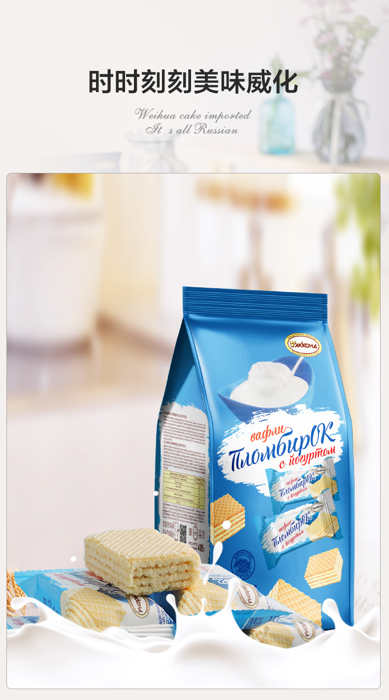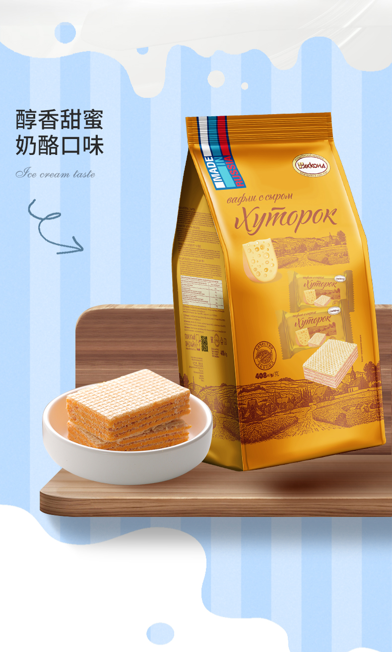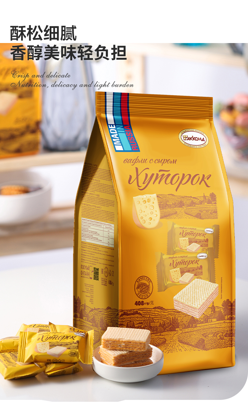 | 【品名】俄罗斯阿孔特 威化饼干 任意口味组合 【规格】408g/包(约25块/包) 【口味】冰淇淋/菲利莫(奥利奥味)/酸奶/奶酪味 【产地】俄罗斯 【保质期】15个月 【生产日期】 冰淇淋、酸奶味、奶酪味:2023年6月及以后 菲利莫:2023年5月及以后 【发货包装】独立包装袋 【发货地】山东,黑龙江 【发货快递】韵达、中通 【不发货区域】新疆、西藏、内蒙、海南、港澳台 【发货时效】48-72小时,周末节假日顺延 |