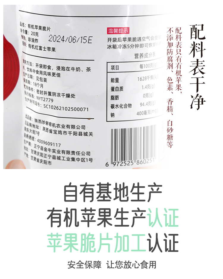 配料:有机红富士苹果 净含量:20g/袋 保质期:18个月 加工工艺:低温真空压差脱水干燥工艺(非油炸) 生产日期:见包装 贮存条件:密封并置阴凉干燥处 执行标准:NY/T2779 出品商:陕西妙耕有机农业有限公司 出品商地址:陕西省宝鸡市千阳县城关镇东大街7号 生产商:正宁县金牛实业有限责任公司 地址:甘肃庆阳正宁县城工业集中区1号 产地:甘肃省庆阳市 食用方法:开袋即食,浸泡在牛奶、茶水、饮料中食用风味更佳 温馨提示: 开袋后苹果脆遇空气会变软,请置于冰箱冷冻5分钟即可恢复松脆口感。 |