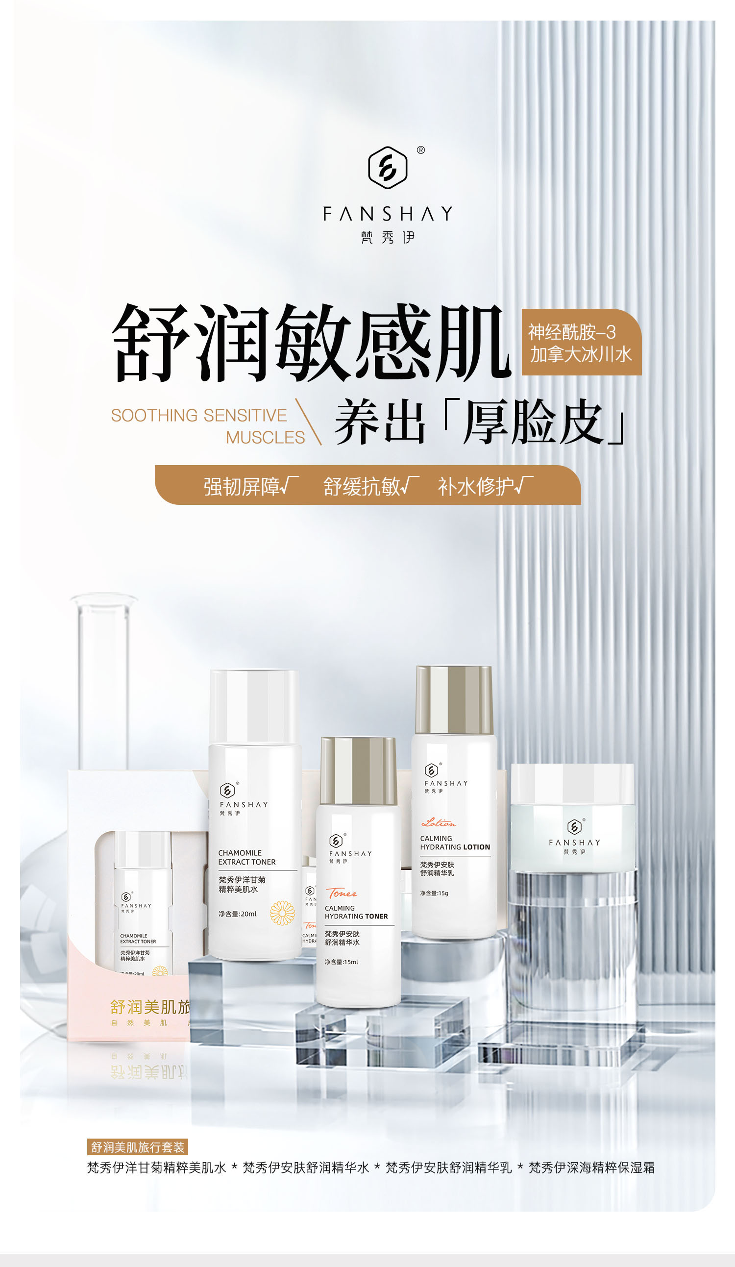梵秀伊(FANSHAY),为女性肌肤问题提供专业性的综合解决方案,从根本上调理肌底层细胞,并坚持以天然植物萃取精华。产品以草本植物为重点,取中草药之精华,辅之现代高科技提纯技术,让肌肤由内而外深层改善