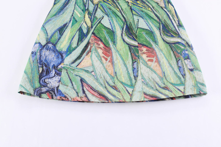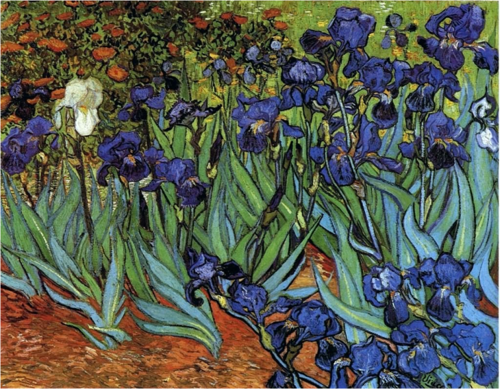 画中的鸢尾花好像是由花和叶子精致编成的纺织品,上面几乎既看不见地,也看不见天。整个画面构图以相同形状的花、相同形状的叶子、相同的颜色反复出现来表现百花盛开的令人眼花缭乱的情景。它远远地就吸引住你的目光。这是一幅很美的作品,画面上洋溢着清新的气氛和活力。画中色彩丰富,线条细致而多变,画面被一片蓝色占去了大半,浅如海蓝,深似墨团——难以揣度的愁楚与痛苦的凝结。连花叶也绿中偏蓝,那忧郁的蓝色属于他,伴着生命而来。构图上,鸢尾花的整体造型 “内倾”,与左上角的一簇野菊呼应。野菊的赭红,与土壤色系相谐。赭红与蓝,二者相接处,有一白色的鸢尾花,朵大,茎长,花蕊正对前方,成为画面的亮点。只是在一片一簇中显得突兀——特立独行孤傲的身影。整个画面充满律动及和谐之感。