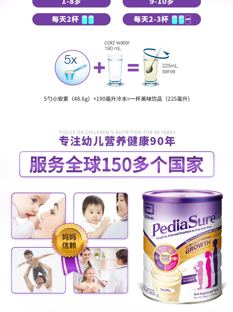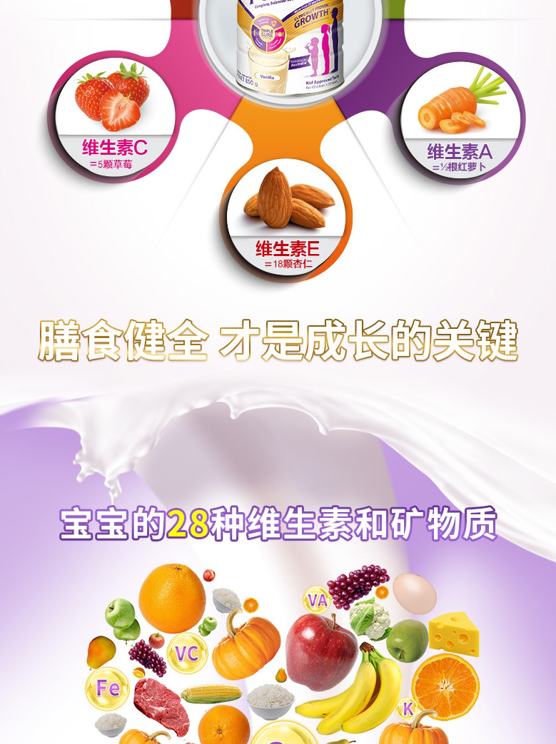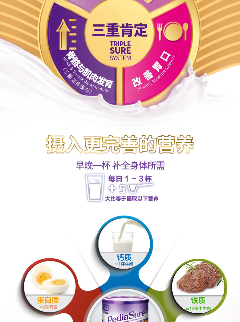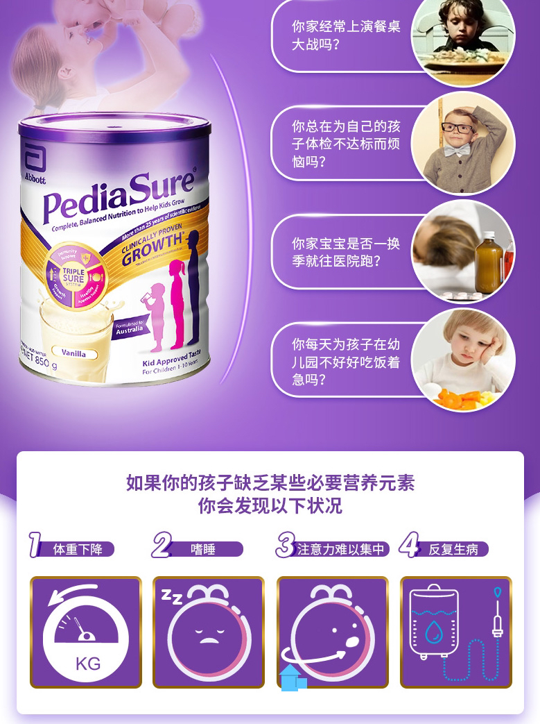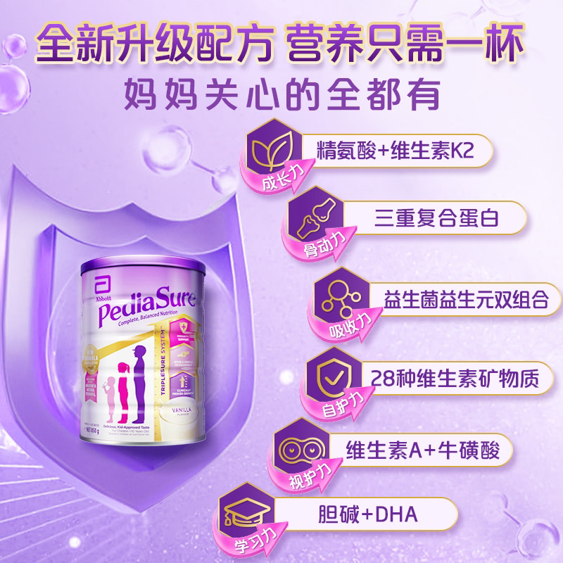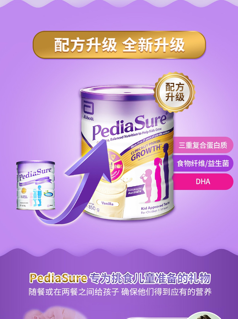 PediaSure 雅培小安素儿童营养奶粉是专为1-10岁偏食或营养不良的宝宝设计,营养全面均衡,采用全新比菲德氏益菌与乳酸菌双效组合及水溶性膳食纤维营养配方。富含有中链三酸甘油酯,双轨碳水化合物,28种维生素和矿物质,牛磺酸,欧米伽3和6,脂肪酸以及肉酸等营养成分。