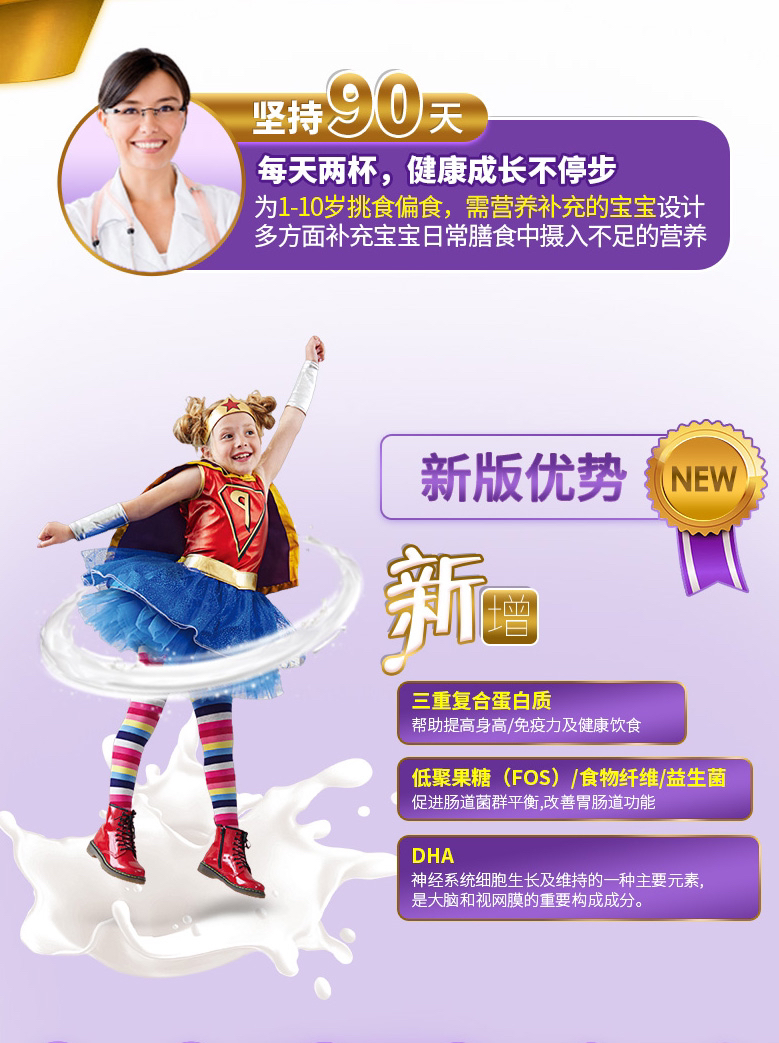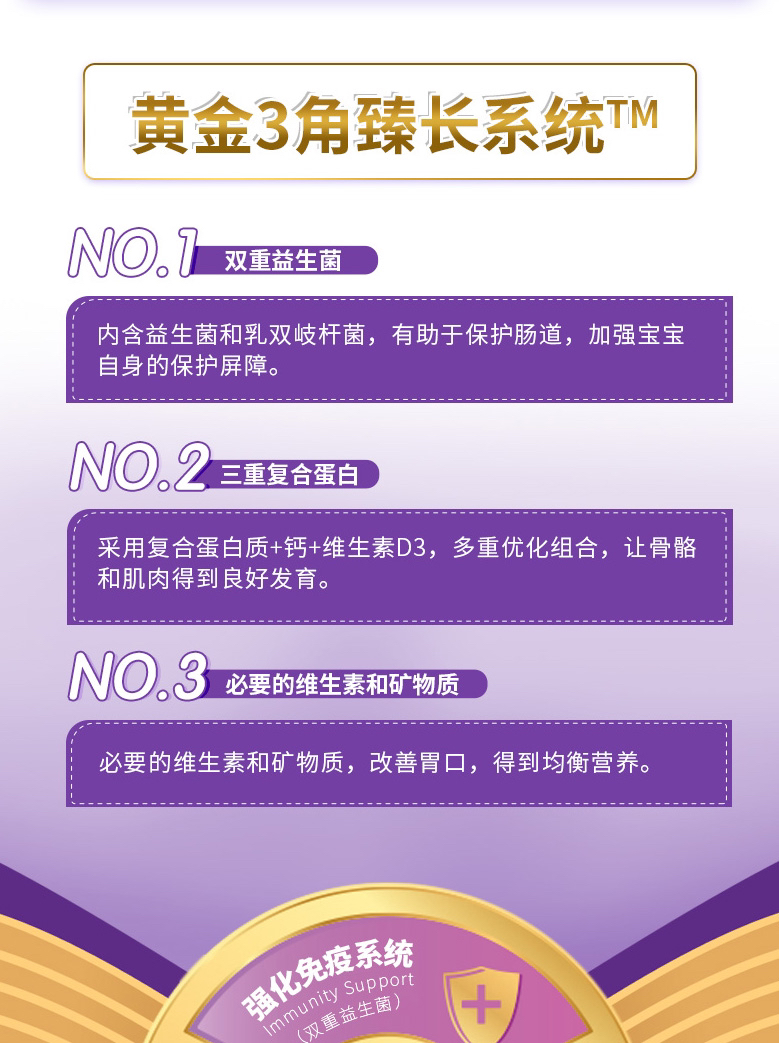 特别添加益生菌和益生元组合,使儿童的肠道更健康,帮助均衡营养,更好的消化吸收,有助于增强宝宝自身防御力。