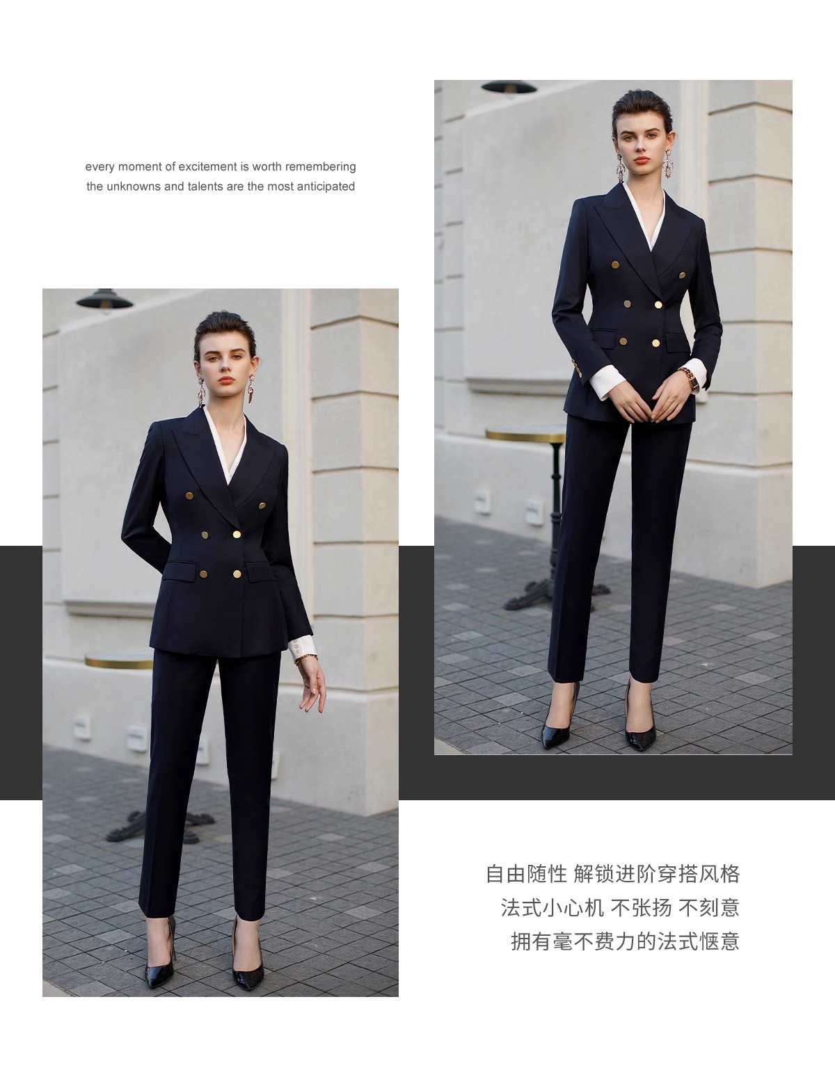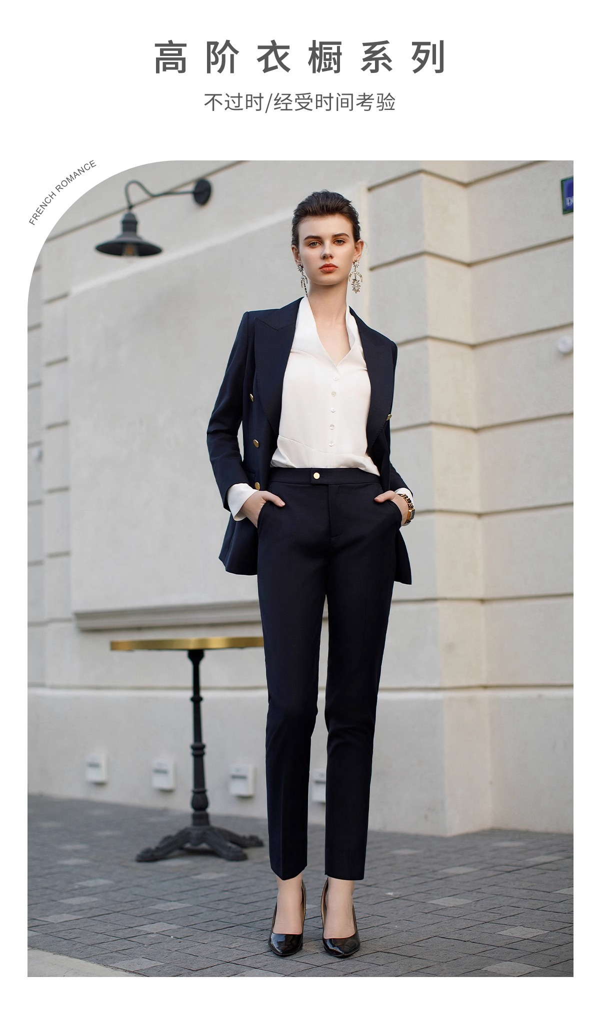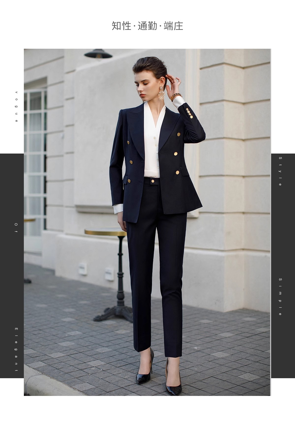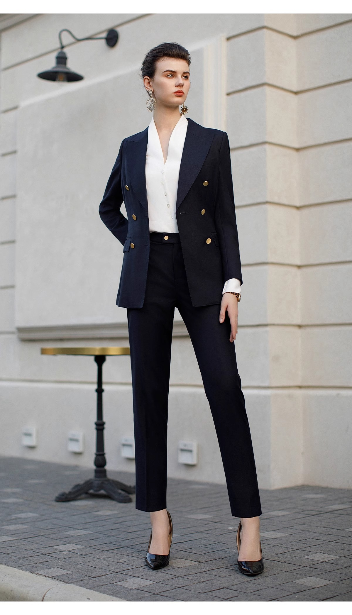 墨蓝色羊毛西装套装女职业正装新款暗格纹干练双排扣西服外套春
