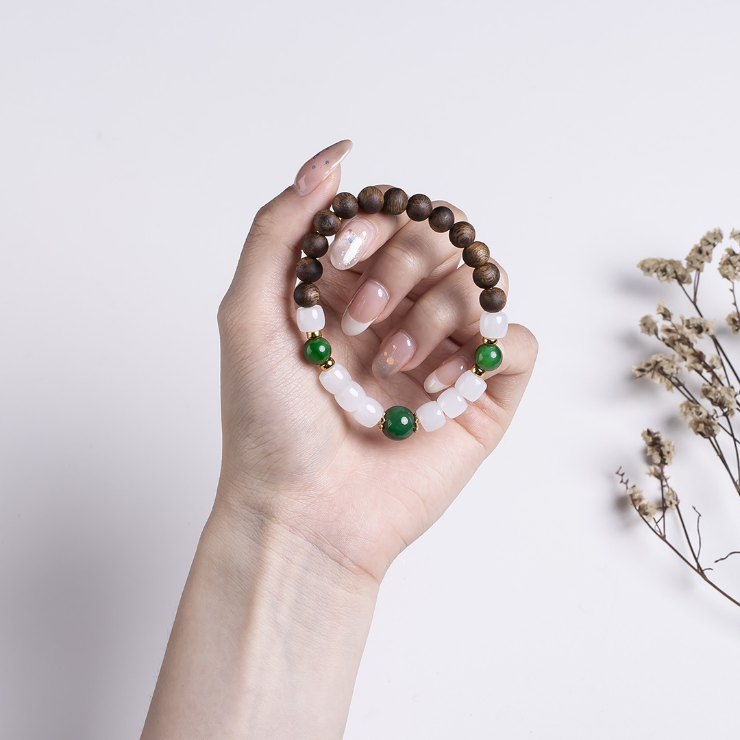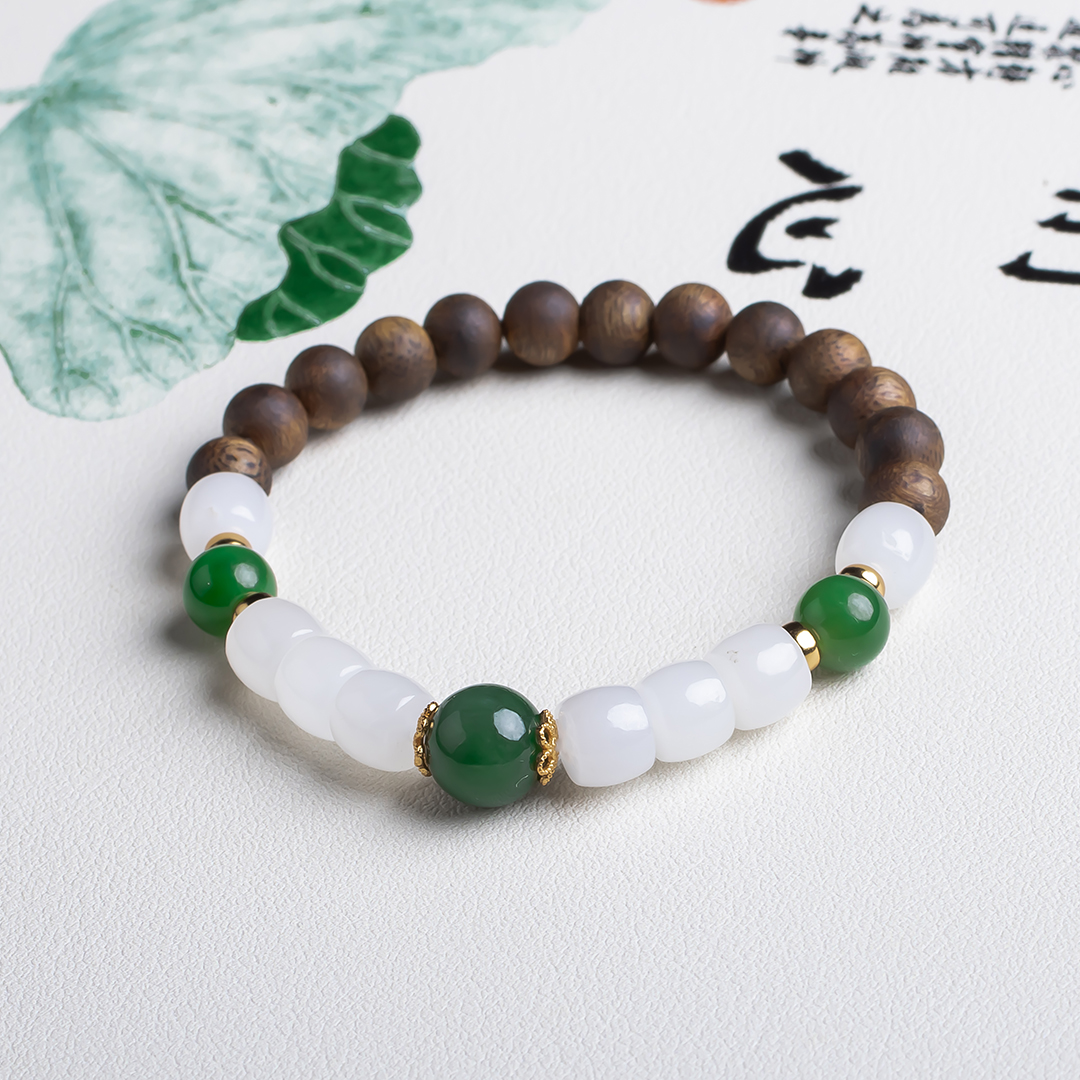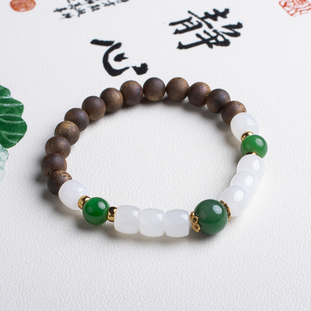 xy0481沉香+和田玉三生三世手串.银,天然沉香约7.3mm,原色原味,香味自然清甜,和田玉白玉桶珠,脂白无瑕,三颗满色碧玉相搭,吉祥与美好,与你相遇,是三生之约。