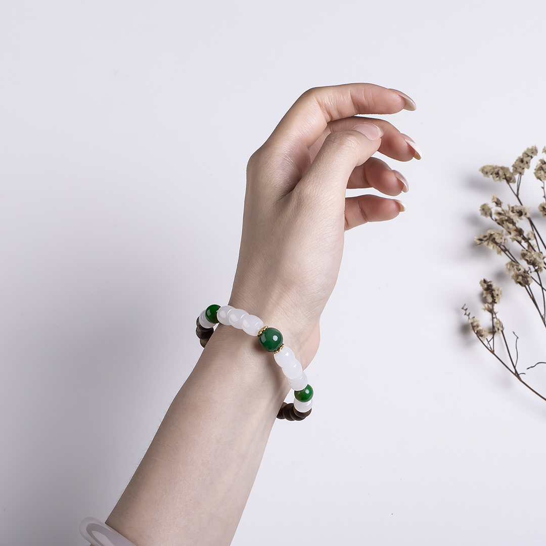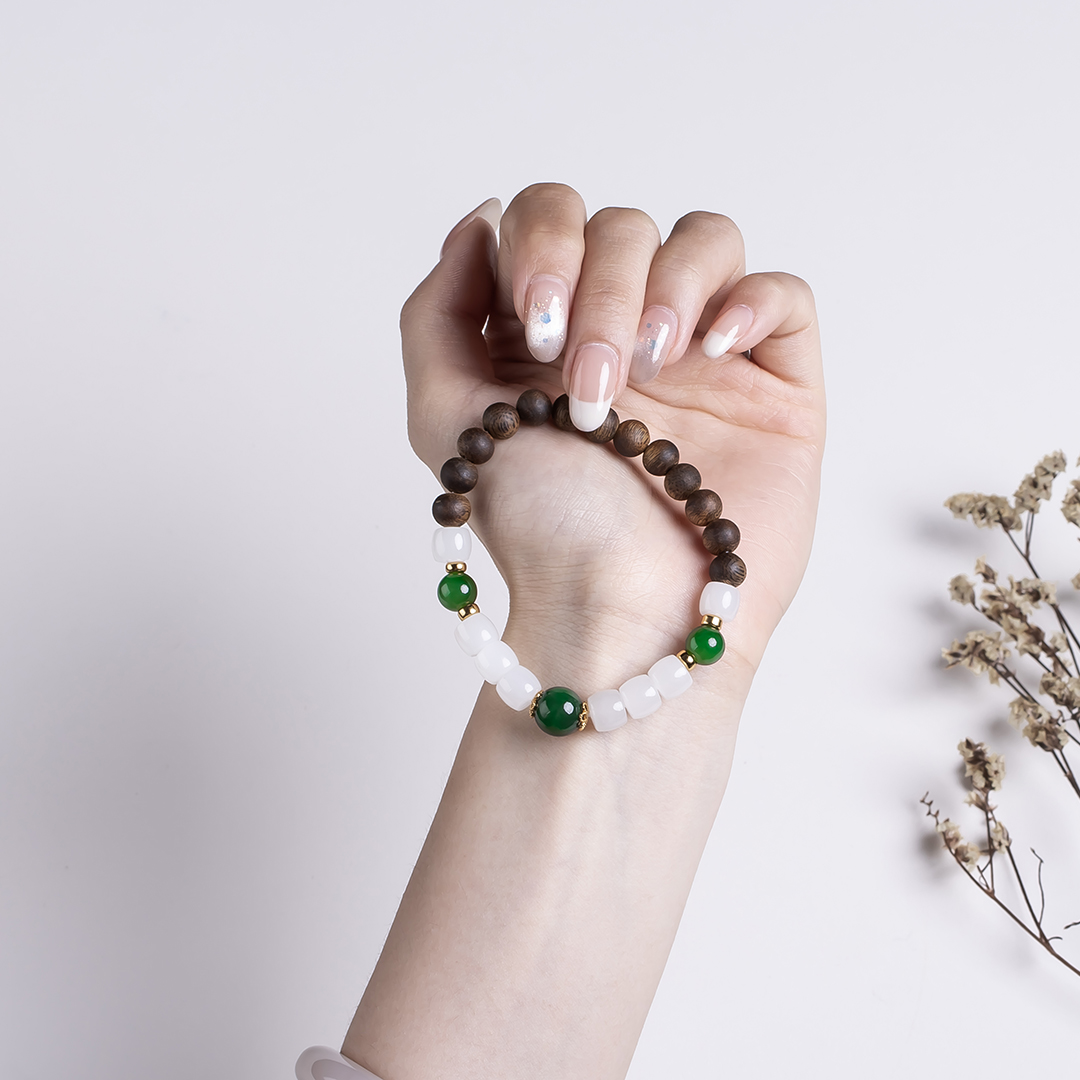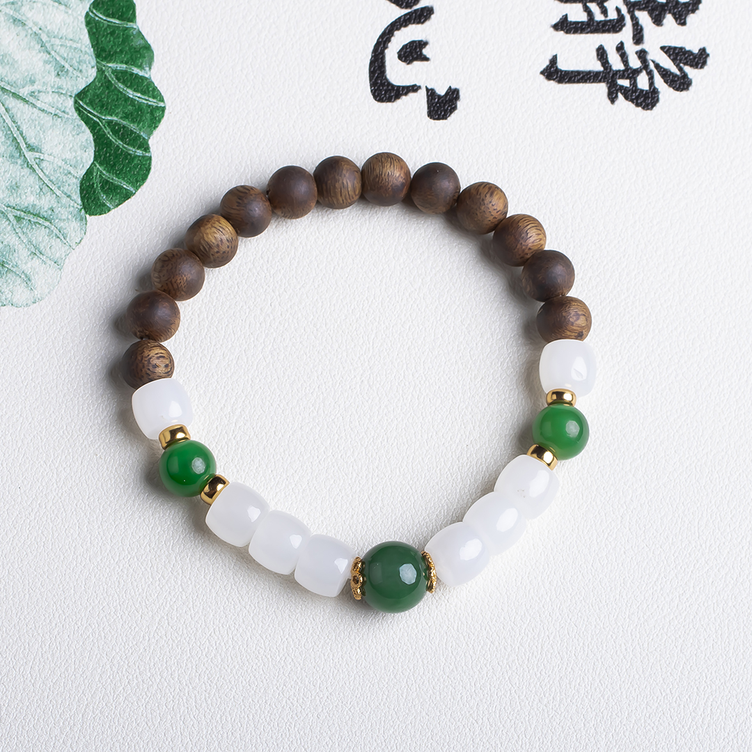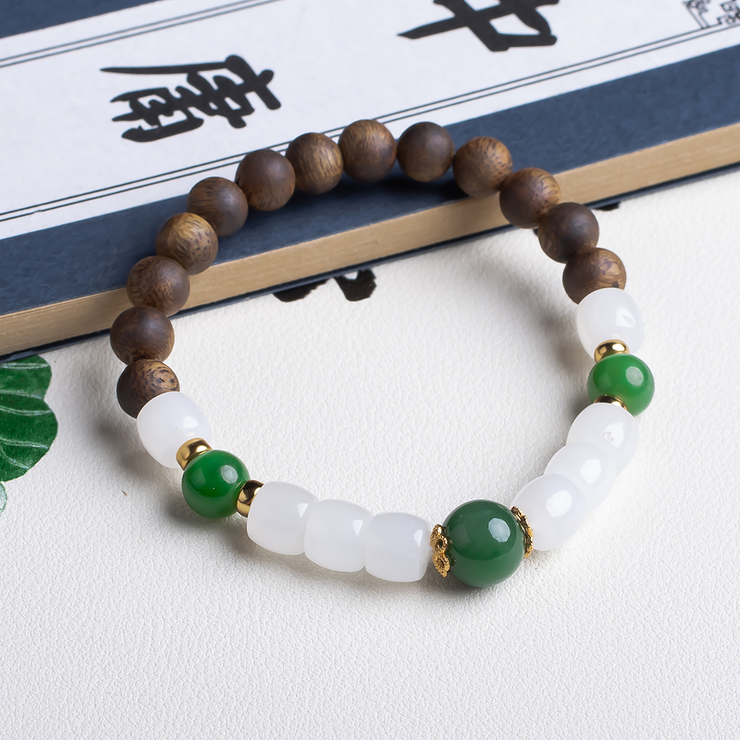 xy0481沉香+和田玉三生三世手串.银,天然沉香约7.3mm,原色原味,香味自然清甜,和田玉白玉桶珠,脂白无瑕,三颗满色碧玉相搭,吉祥与美好,与你相遇,是三生之约。