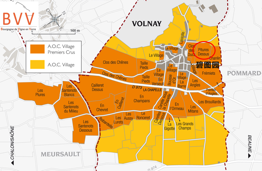 葡萄园Vineyard :位于沃尔奈村北部的山坡上,近波玛村(Pommard),坡度可达到40米,靠近坡顶的是泥灰质石灰岩,靠近下方的土壤是较硬的石灰岩。土壤整体来说偏凉,属于石灰岩非常深厚的粘土石灰质土壤。“碧图园”是沃尔奈村最强劲的地块,葡萄酒风格接近波玛村。既有波玛村的丰富浓郁,又有沃尔奈村的细腻优雅。