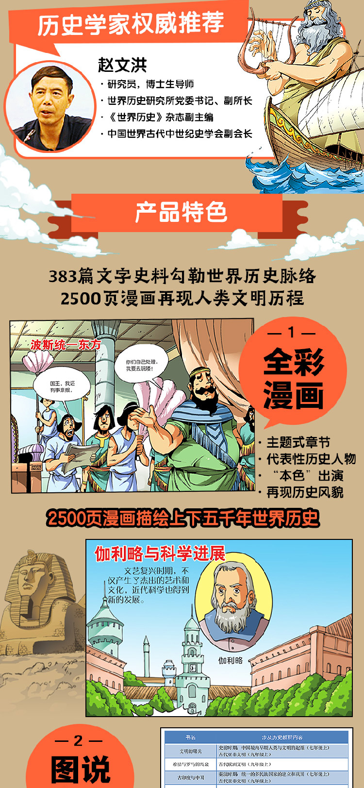 本系列图书以世界历史发展为脉络,梳理了从远古到21世纪末漫长而辽阔的世界史,用孩子喜闻乐见的漫画形式展现世界各个重要历史时期的风貌。书中选取丰富的历史图片及文史资料,用生动的笔触描写了影响世界历史进程的各类重DA历史事件,塑造了无数影响世界文明发展的鲜活的历史人物,将浩繁的史实娓娓道来。为了拓宽孩子的视野,书中还设置了“史海漫游”“DA事记”等精彩小栏目,让孩子们既可以从横向的角度探究某个国家的历史发展脉络,也可以从纵向的角度获得同一时期世界上不同文明的多姿多彩。本系列图书提供的百科全书式的信息量也使它成为孩子学xi历史的有效工具,让孩子们通过阅读进行深度思考,可谈古*今,鉴往知来。