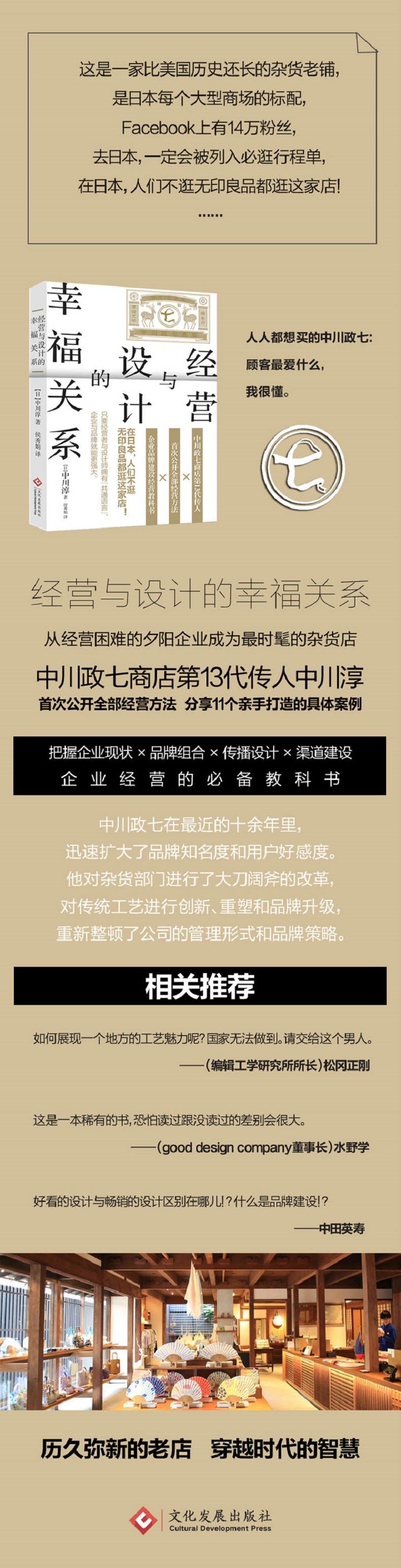 300年历史的杂货老铺中川政七商店,是日本每个大型商场的标配,Facebook上有14万粉丝,去日本一定会被列入必逛行程单……它从经营困难的夕阳企业成为*时髦的杂货店,第13代传人中川淳*次公开中川政七商店的全部经营方法,告诉你如何复兴传统工艺,让品牌获得新生。从“把握企业现状”到“品牌组合”“传播设计”“渠道建设”,教你观察和挖掘顾客的需求,并在此基础上进行产品和传播的设计。