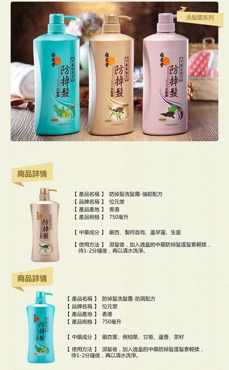 位元堂防掉发洗发露配方由银杏、制何首乌、生姜、墨旱莲护发健发中草药精制而成。以先进科技萃取的中草药精华结合其他有效成份,能彻底、温和地洁净发丝及头皮。银杏具有抗氧化作用,有助毛囊及发根重生,茁壮每一根发丝,达至防掉发效果。 配合药材防掉发护发素使用,能更有效地护发活发,改善掉发问题,令您的秀发份外柔顺亮丽。配方独特的芬芳香气,给您焕然一新的感觉。