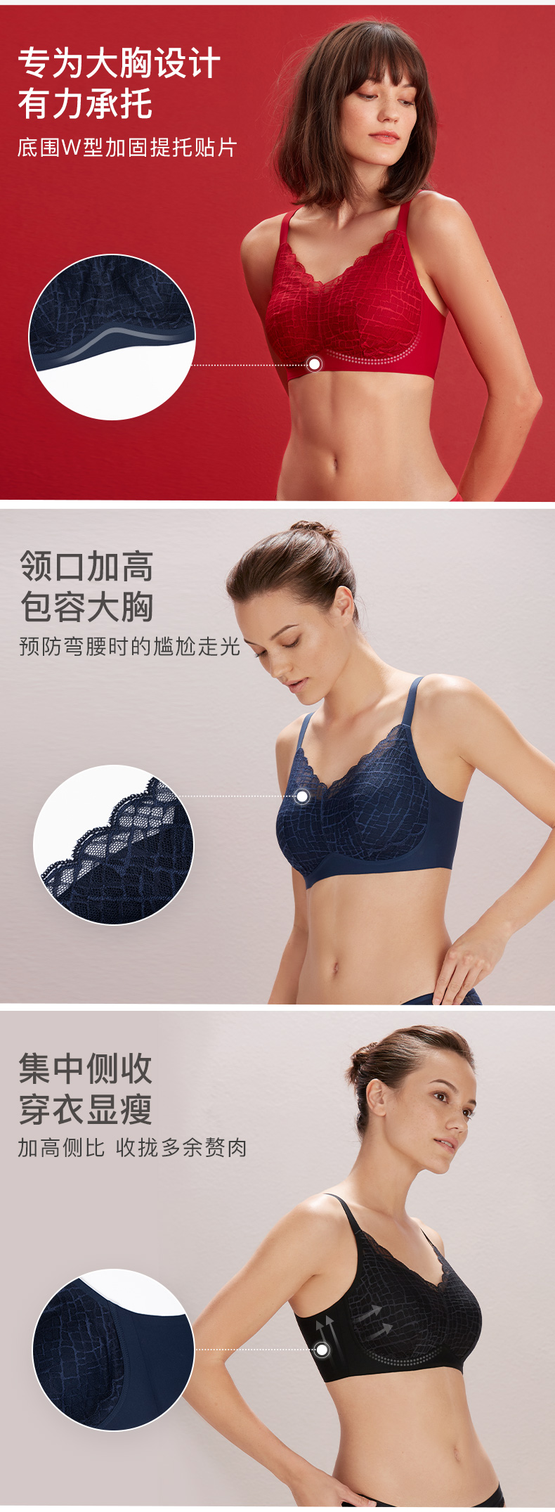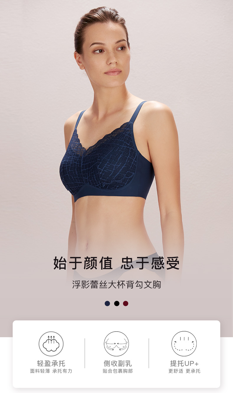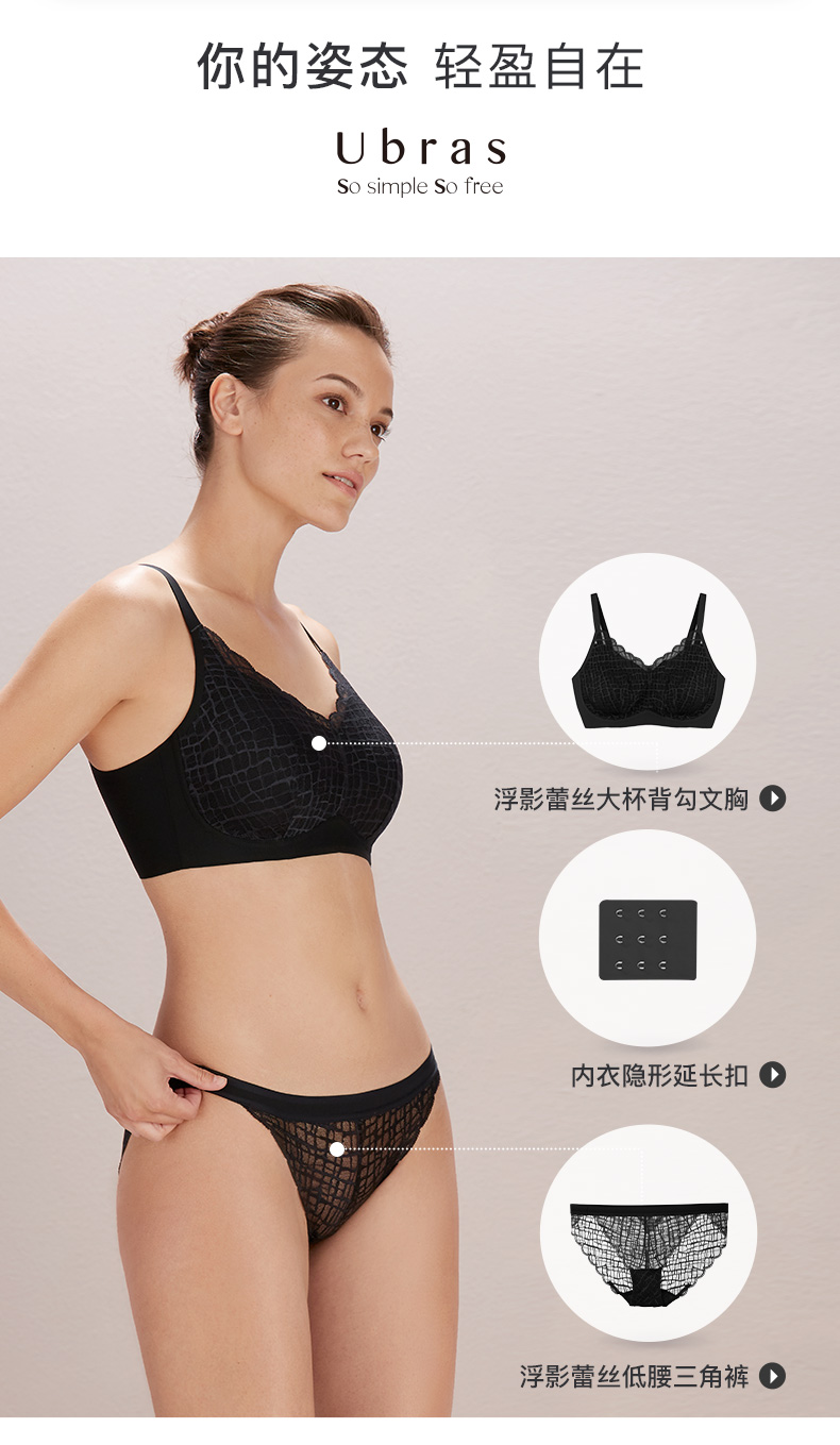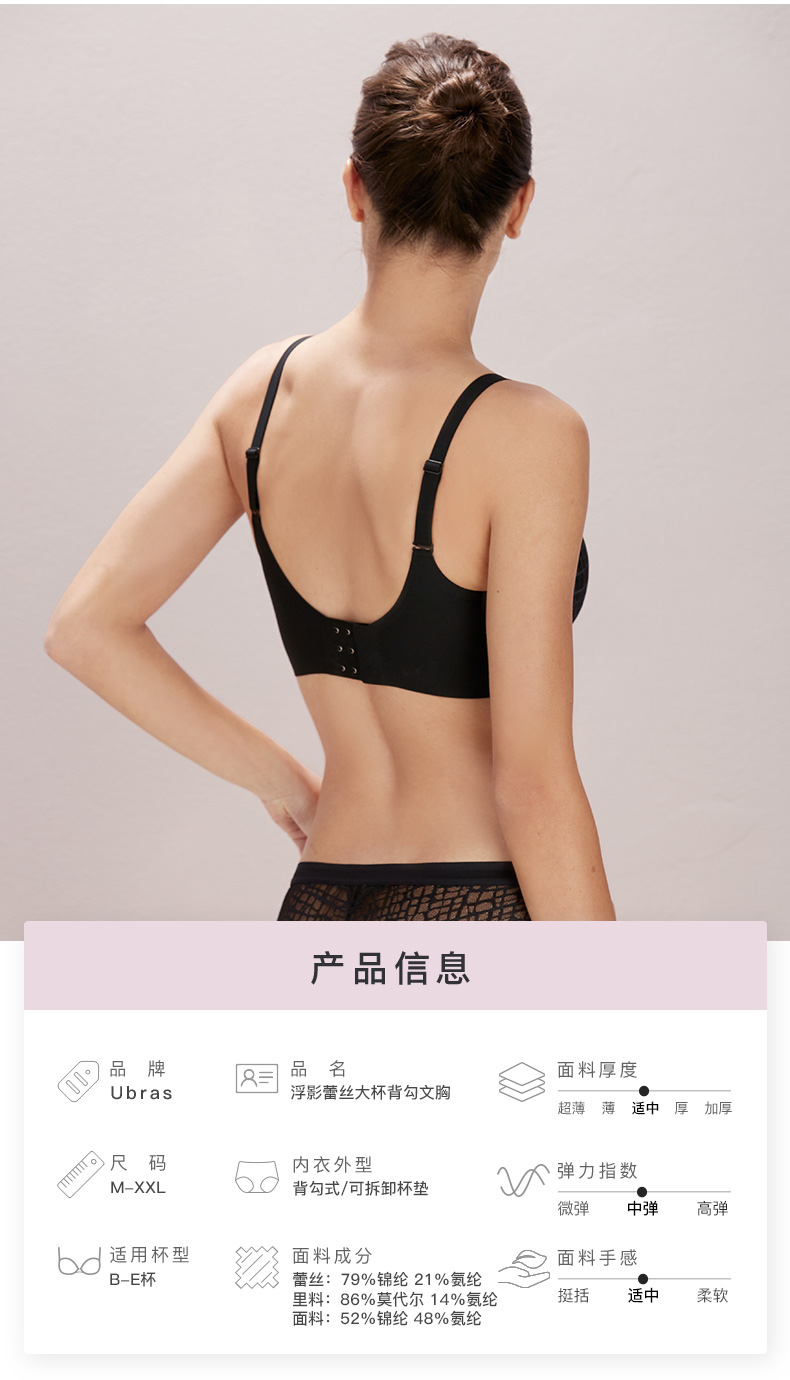 Ubras浮影蕾丝大杯背勾文胸V领内衣女无钢圈性感透气女士胸罩