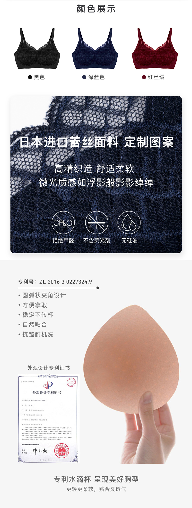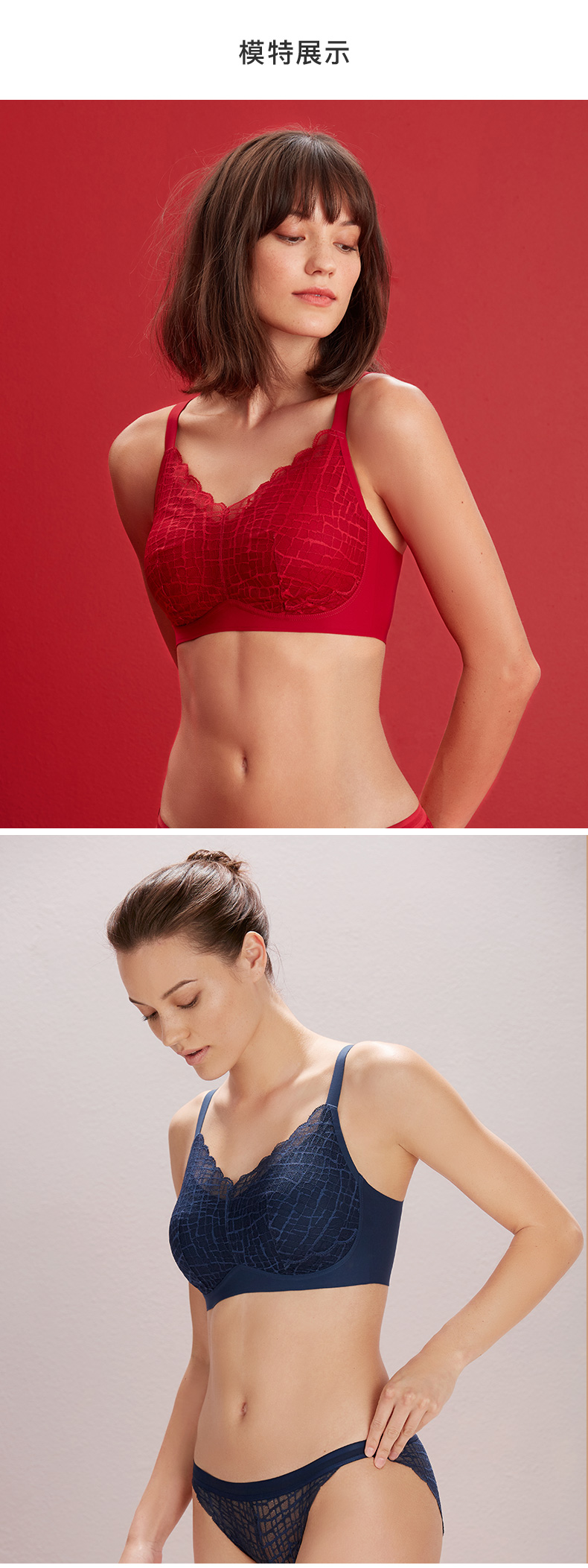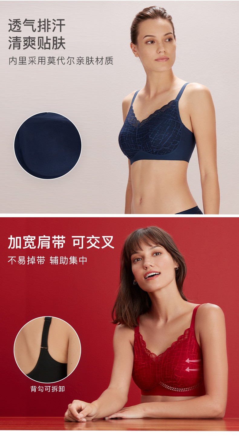 Ubras浮影蕾丝大杯背勾文胸V领内衣女无钢圈性感透气女士胸罩