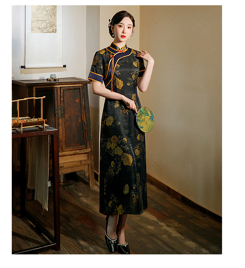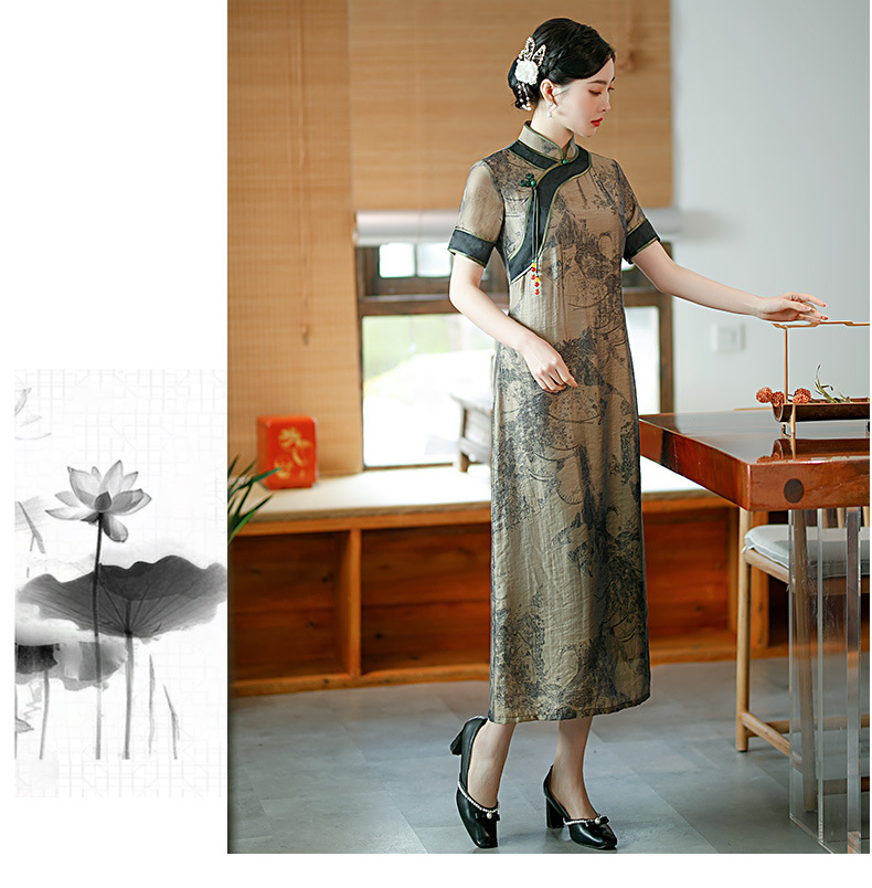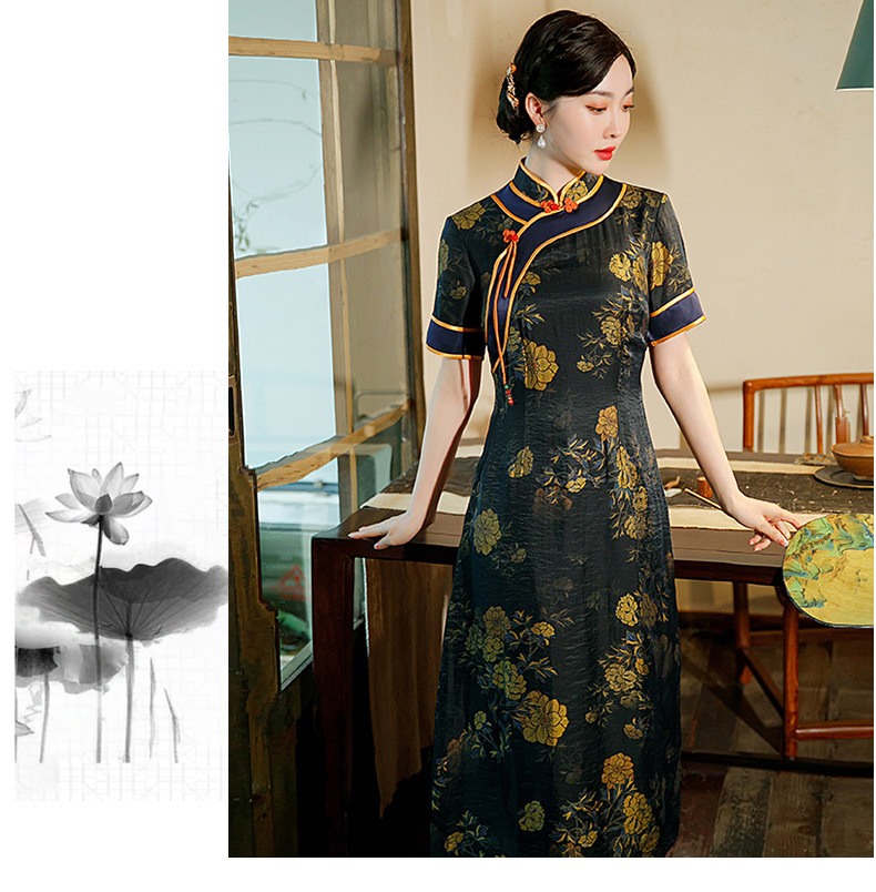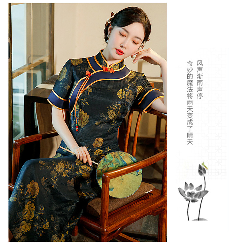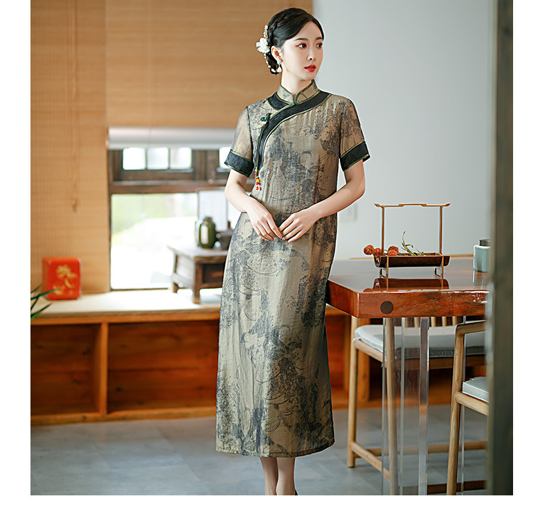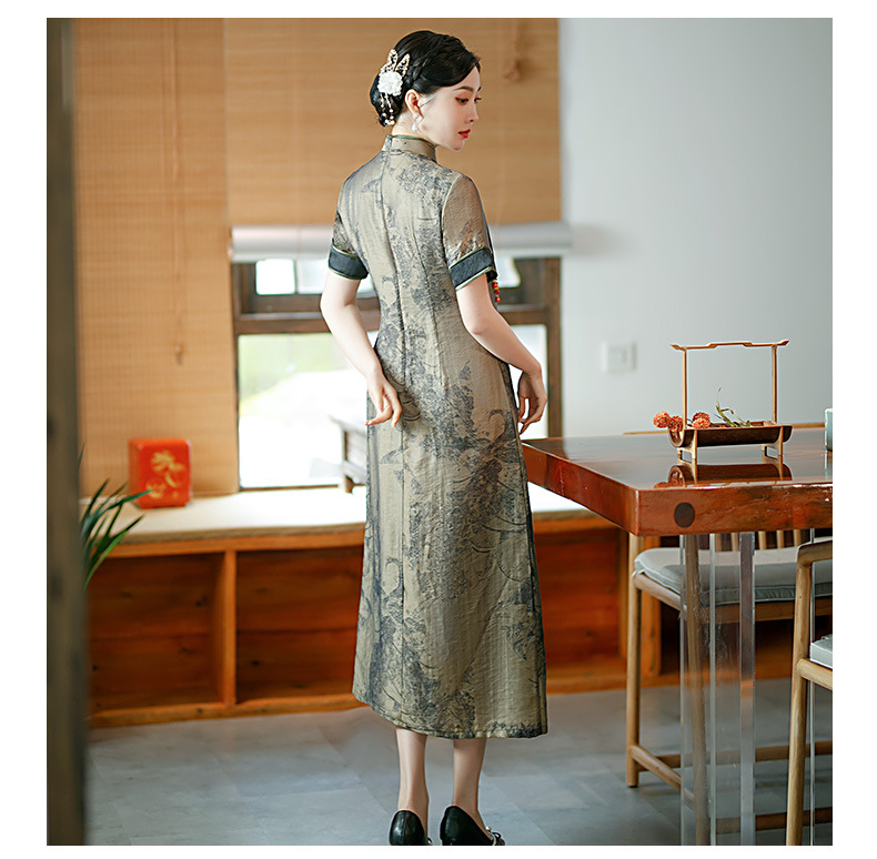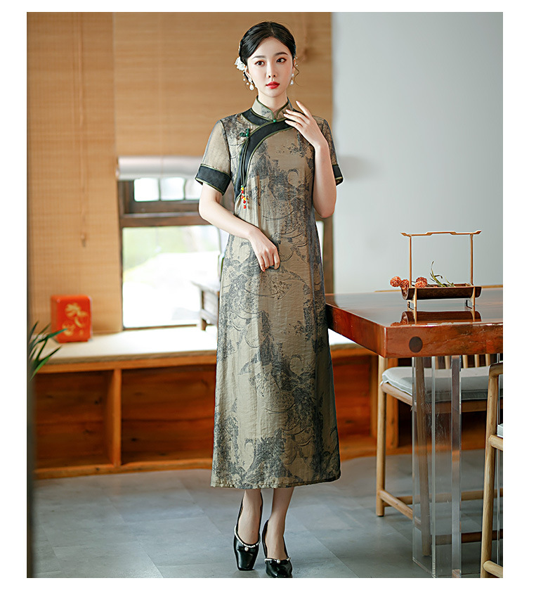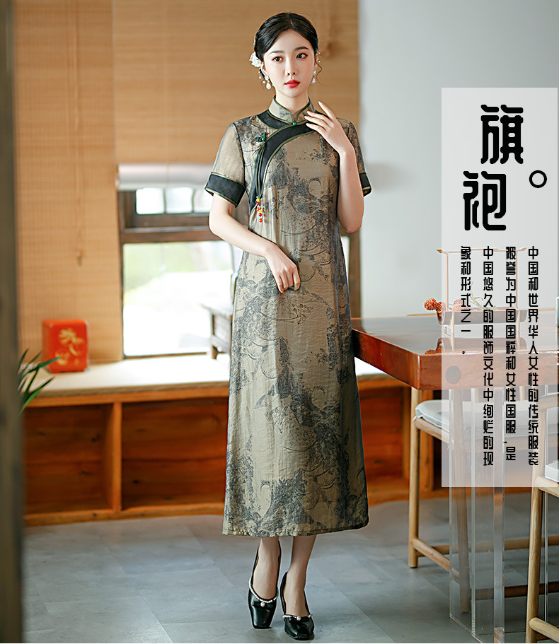 GSJ-3086新款夏季旗袍长款短袖人丝时尚日常优雅淑女大码连衣裙