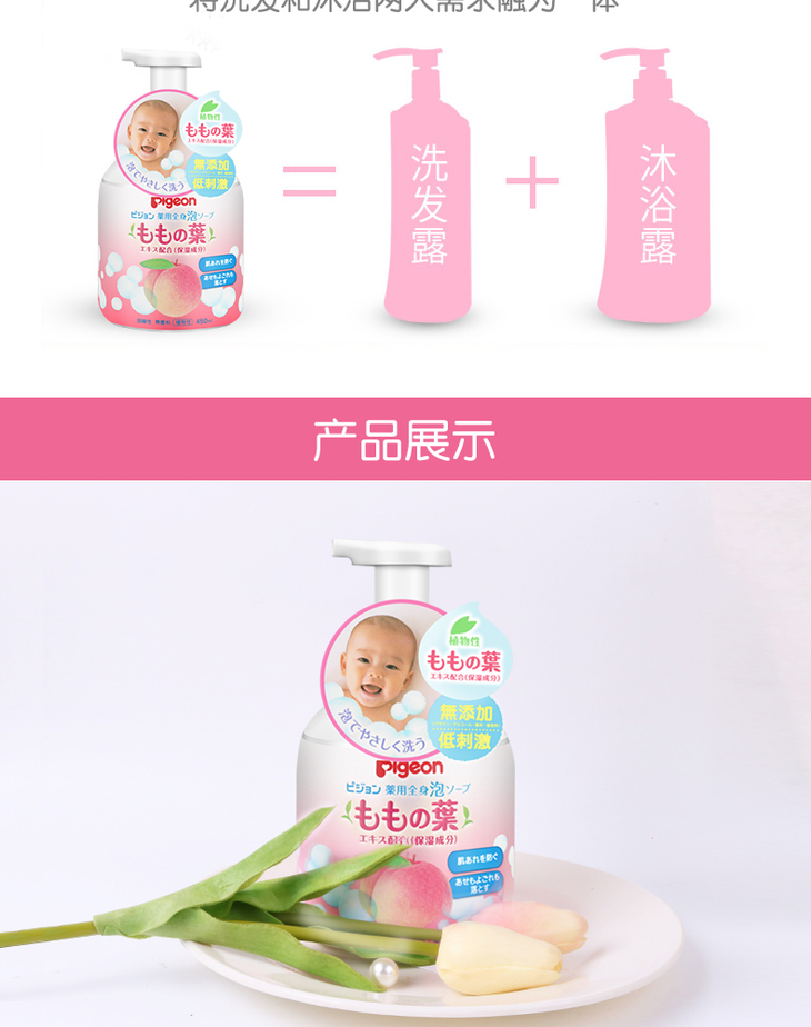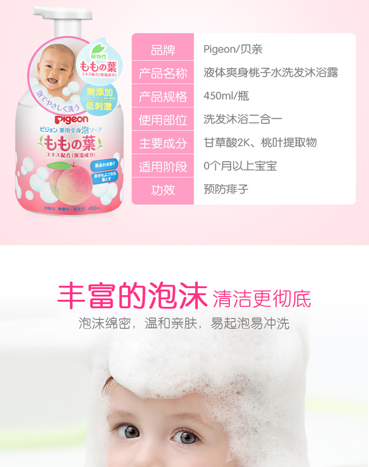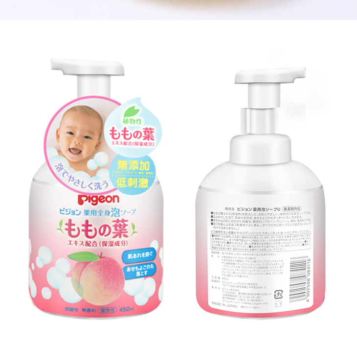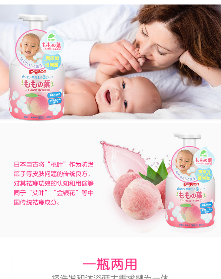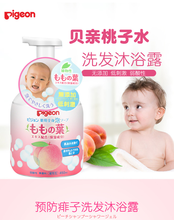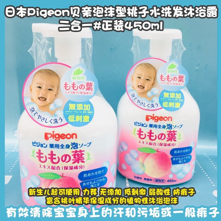 日本Pigeon贝亲泡沫型桃子水洗发沐浴露二合一#正装450ml/#补充装400ml👍🏻貝親桃子沐浴露,🔆新生儿起可使用,力薦!無添加 低刺激 弱酸性 防痱子。🎈富含桃葉精華保濕成分的植物性沐浴泡沫,💦柔軟的泡沫可以防止皮膚乾燥,🍀並能有效清除寶寶身上的汗和污垢或一般痱子皮膚問題能解🉐決!