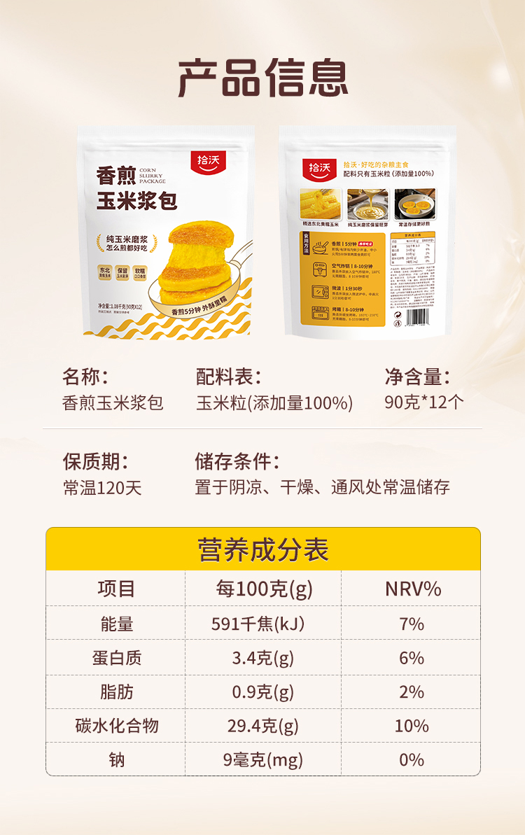 优选|拾沃 香煎玉米浆包 纯玉米粒磨浆 低脂早餐 1080g/袋(90g*12个)