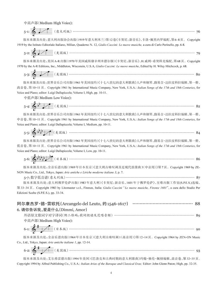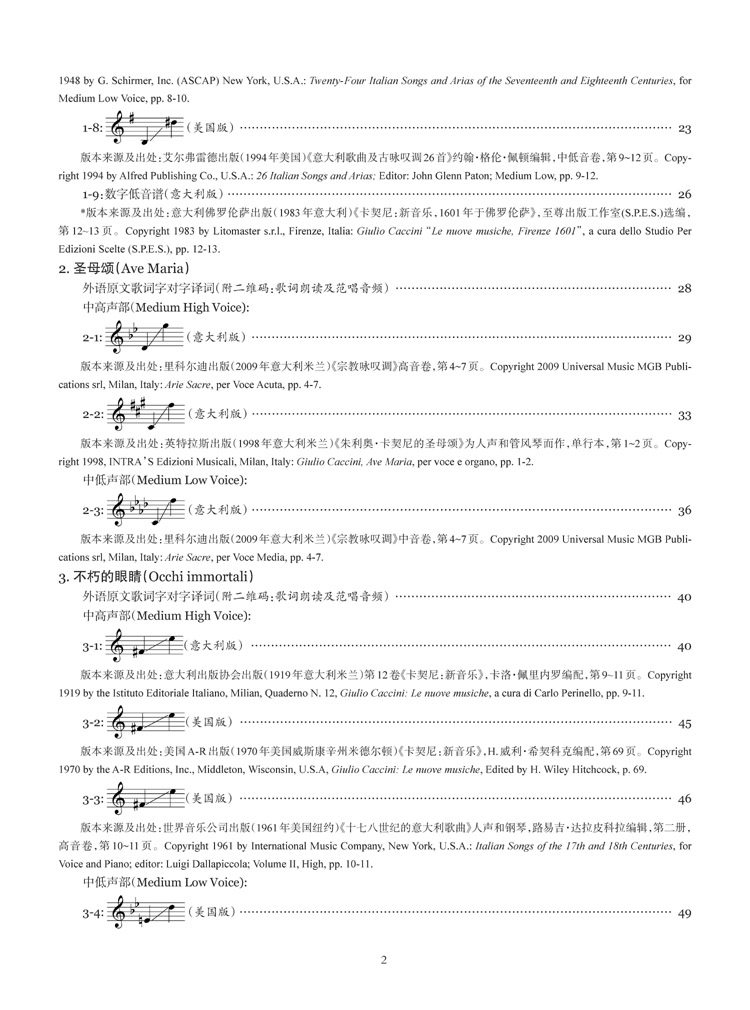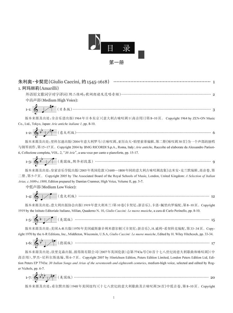 以各位亲熟悉的意大利古典声乐作品《阿玛丽莉》的曲作者G.卡契尼(Giulio Caccini, 1548-1618)为例,他是意大利古典独唱歌曲的创始人,但国内多年来只有他的一首《阿玛丽莉》得以传唱,而欧美各国在多年的声乐教学中却频繁采用了他的其他一些曲目,所以本册乐谱率先集中选编了包括他的《不朽的眼睛》《向星辰倾诉》《情人们,你们听着》以及《圣母颂》等在内的多首名曲。需要说明的是,网上确有传言《圣母颂》是卡契尼的伪作一说,但意大利著名的音乐出版公司Ricordi一直以来都把这首《圣母颂》归为卡契尼的作品,至今学界也未有定论,因而从介绍曲目的角度出发,本册乐谱仍然选编了这首名曲。