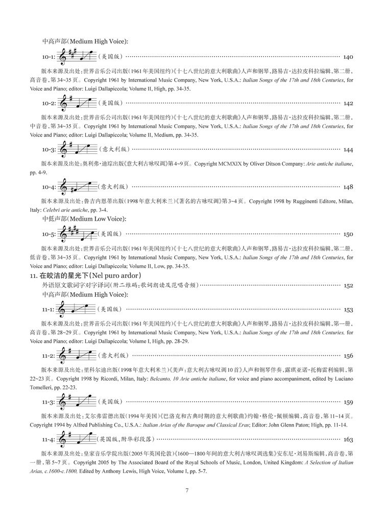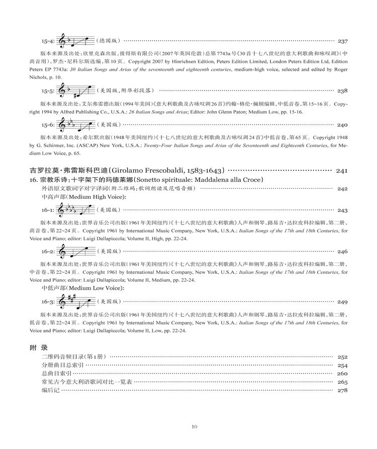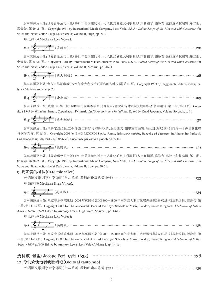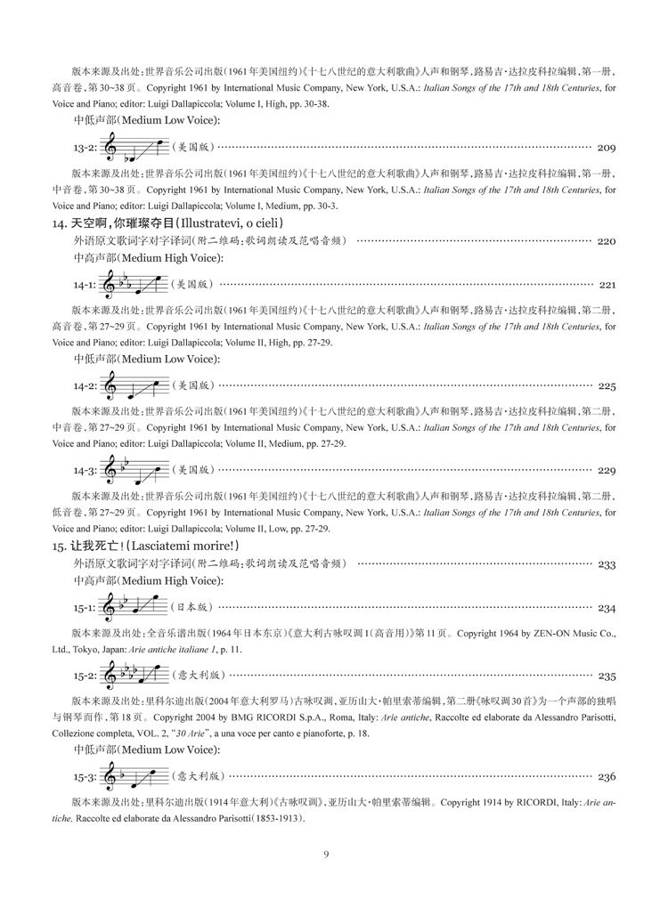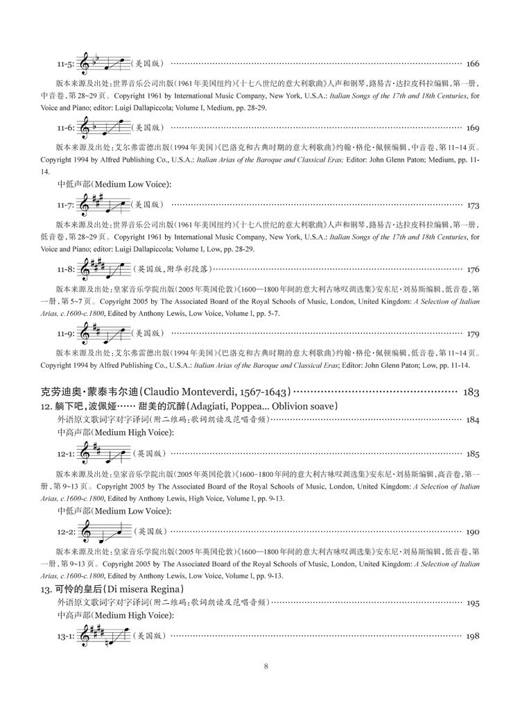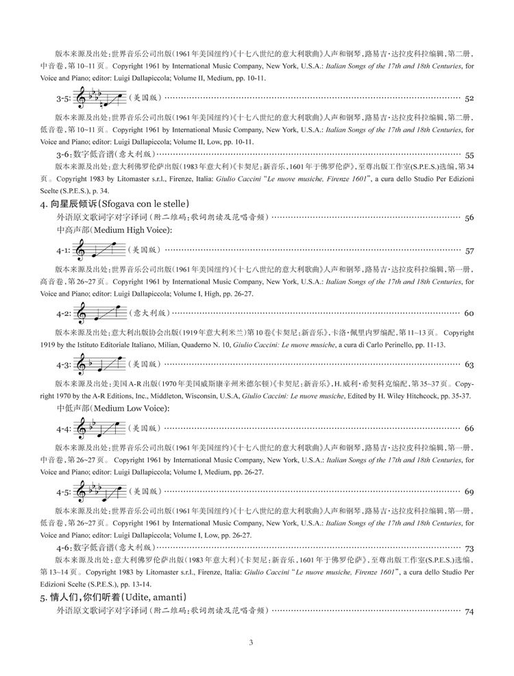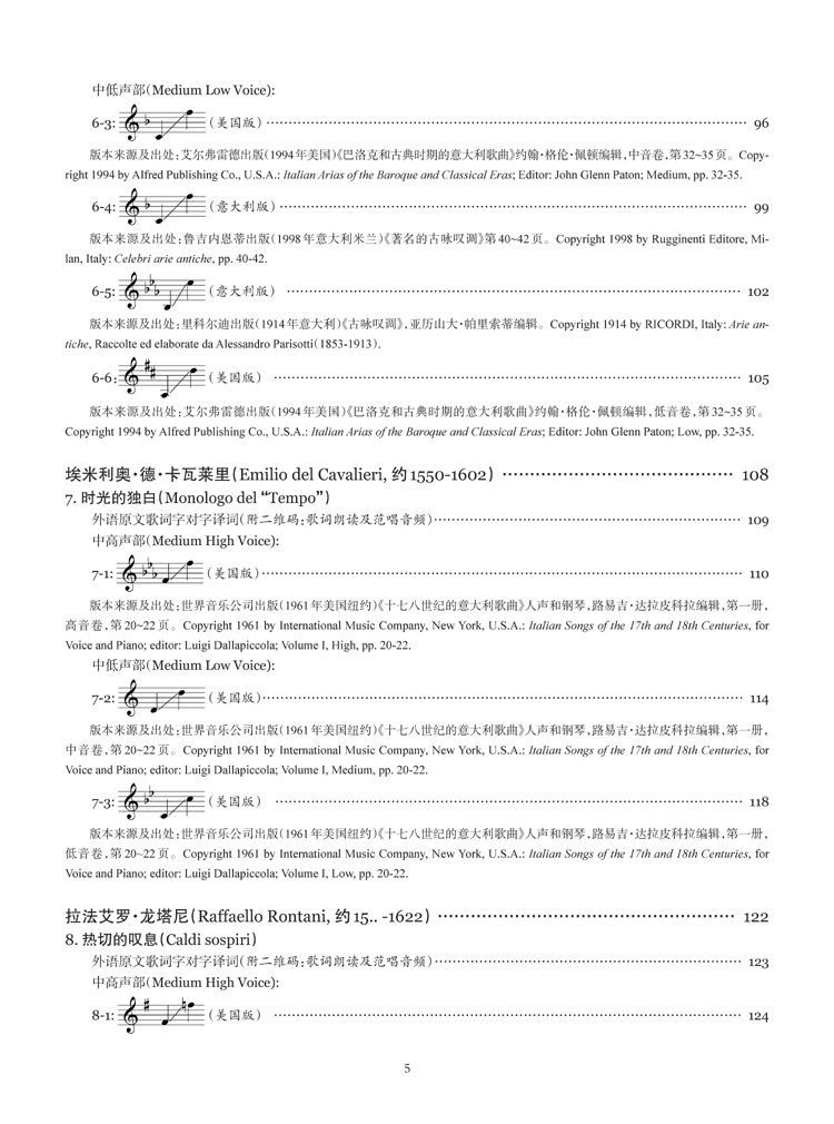 需要说明的是,国内以往选编的这个时期的曲目总量偏少且略显单调,随着国内声乐教学的不断的发展和进步,现今需要把更多相关时期的作曲家的优秀作品介绍到国内来。因此,本套乐谱除了收编有国内声乐界较为熟悉的一些曲目,另外还有一些曲目是国内全新出版,以起到推陈出新、丰富教学曲目的作用。