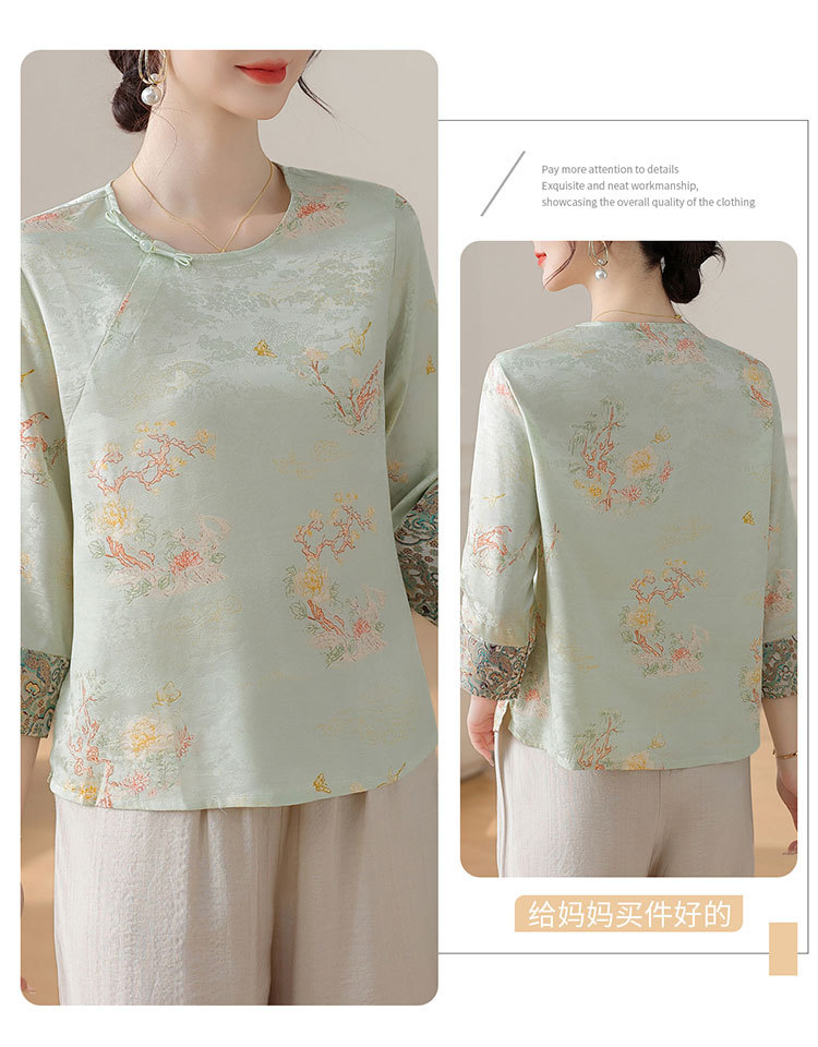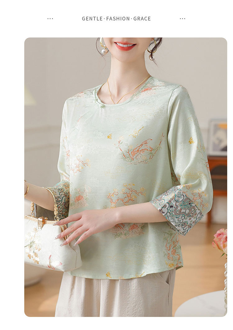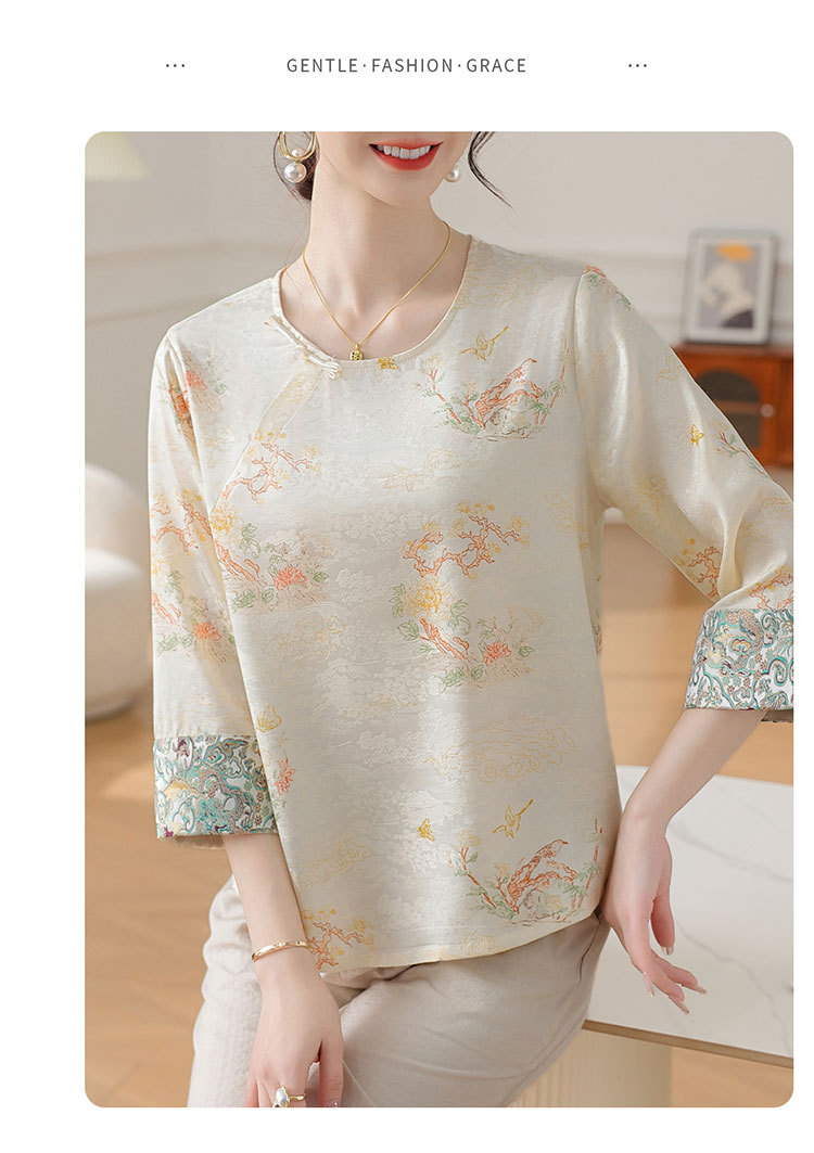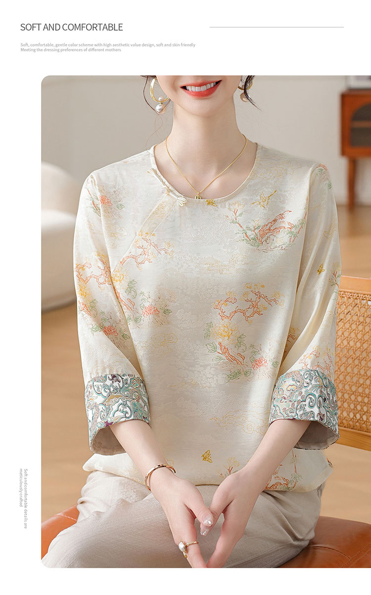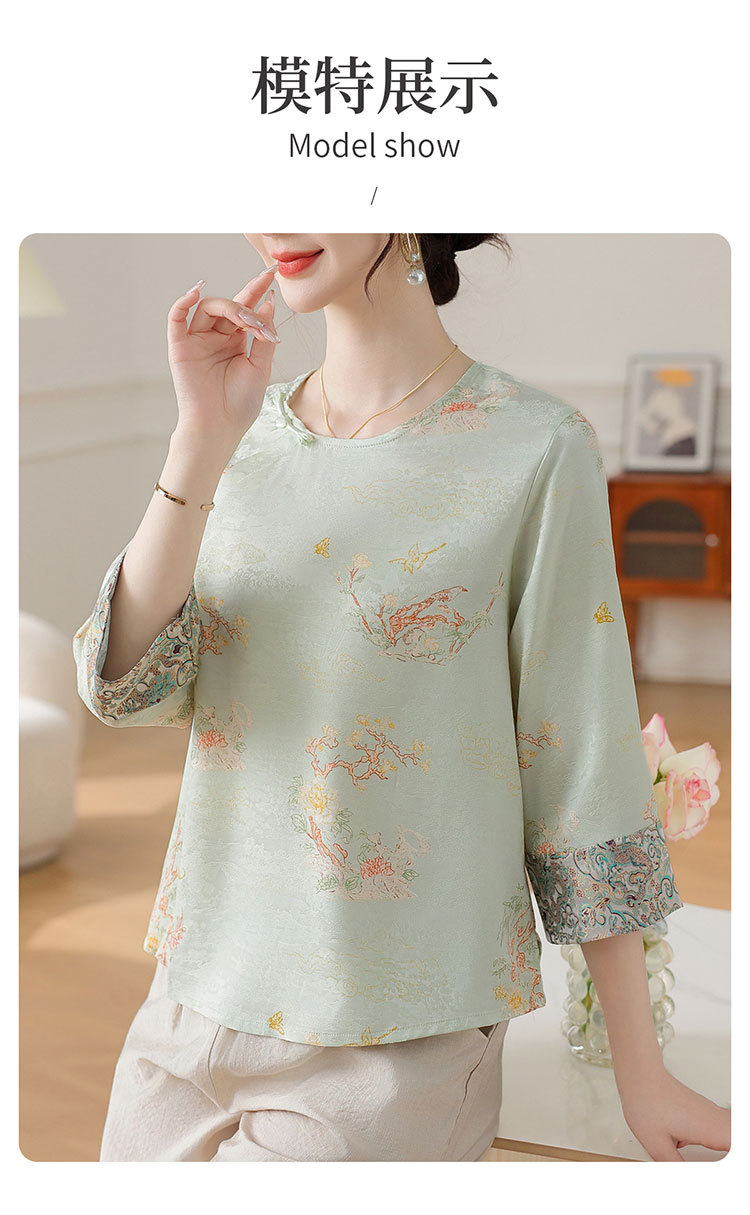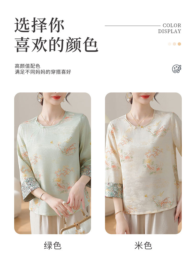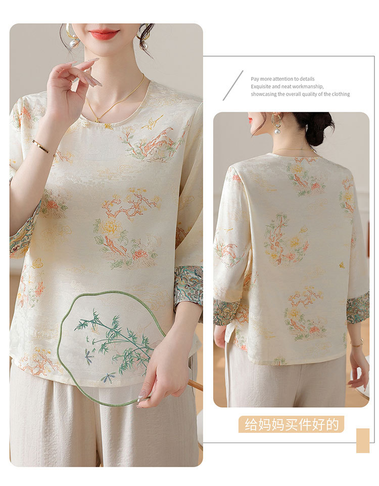 W590-SR331-75-128妈妈夏装雪纺印花中袖上衣中老年女2025新款时尚圆领T恤气质小衫