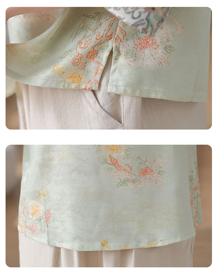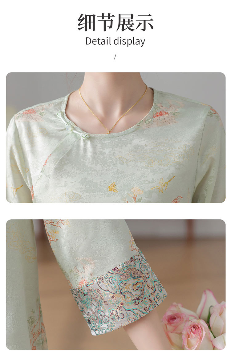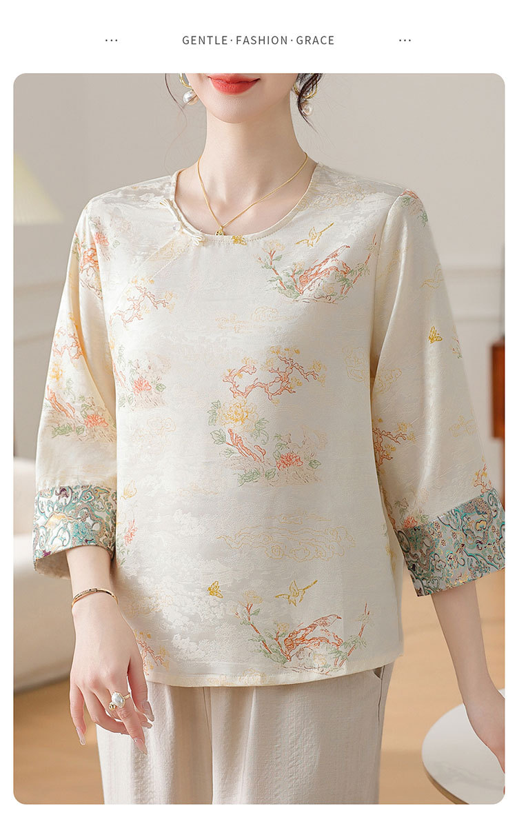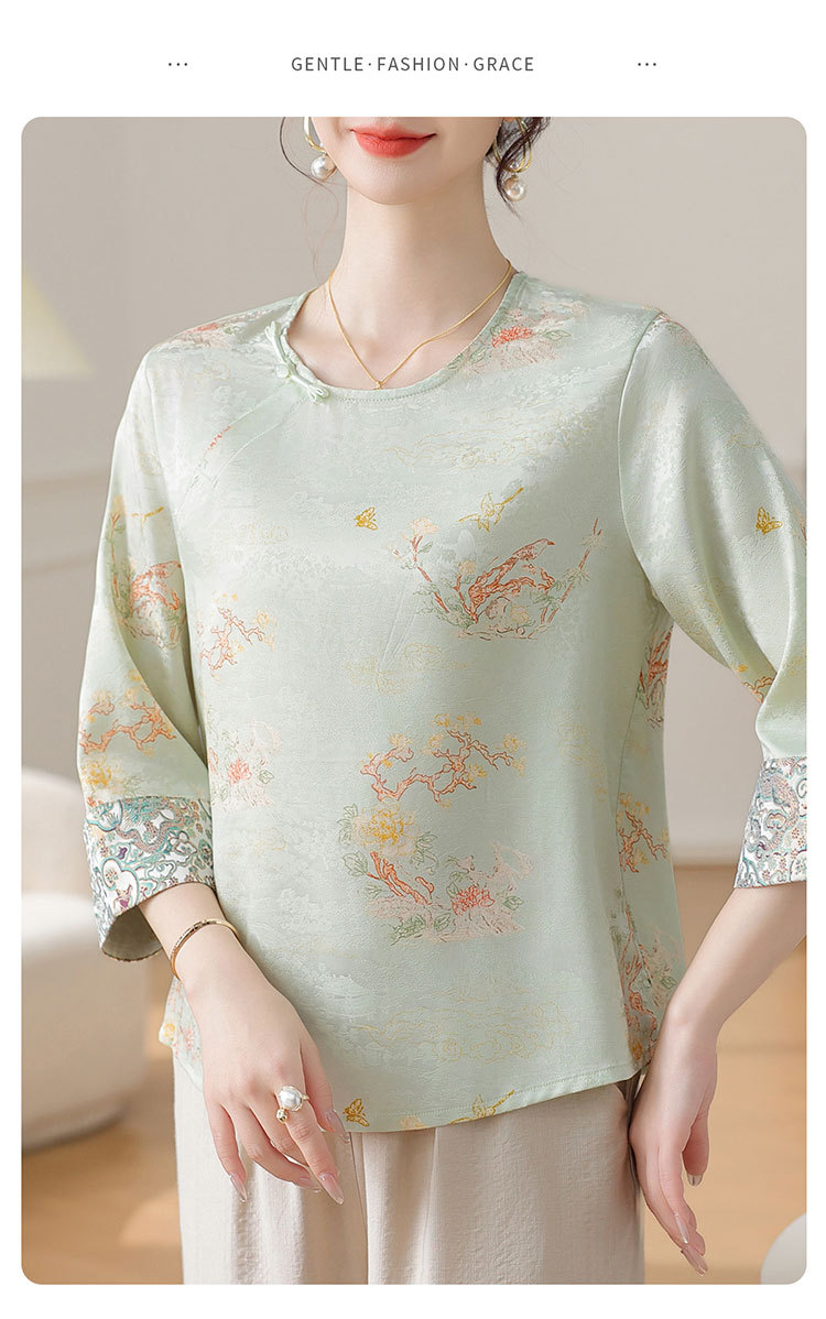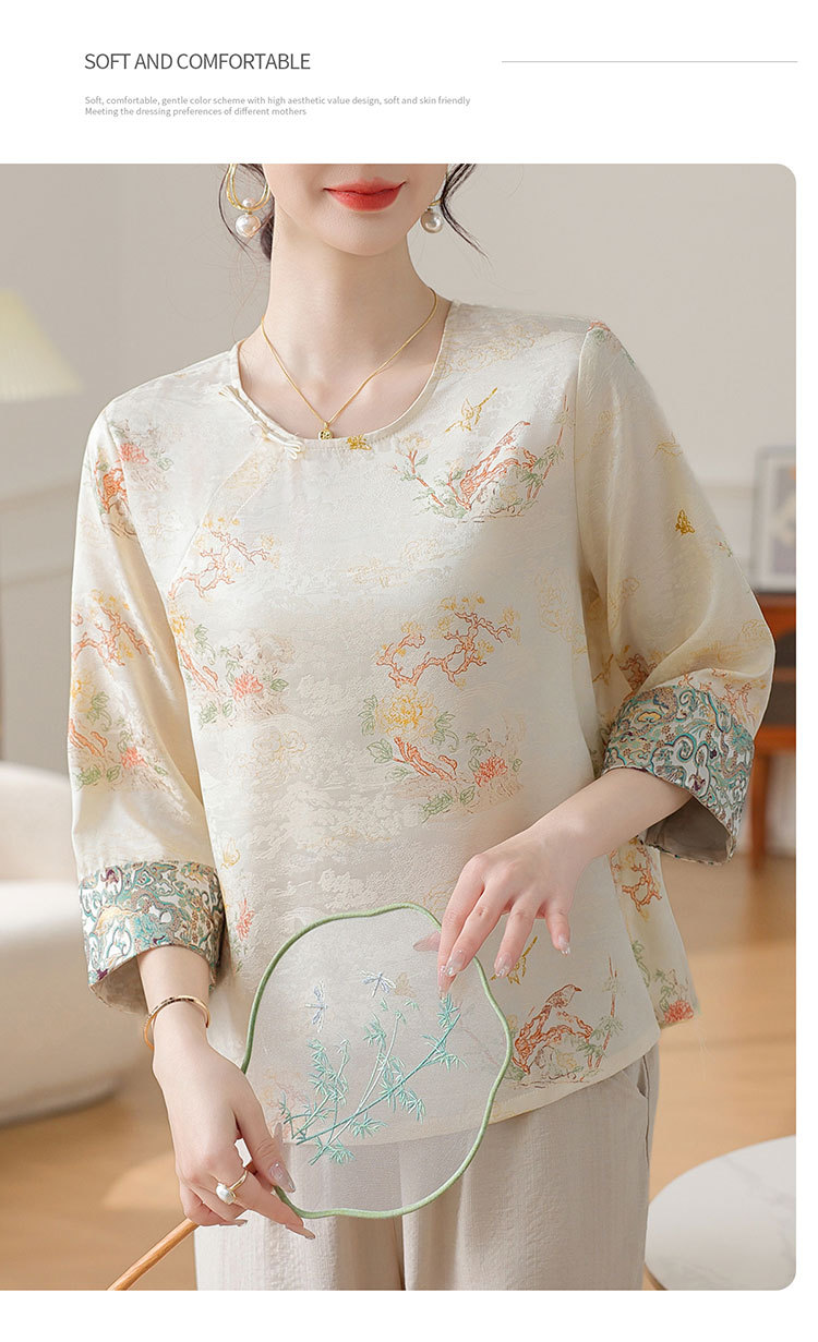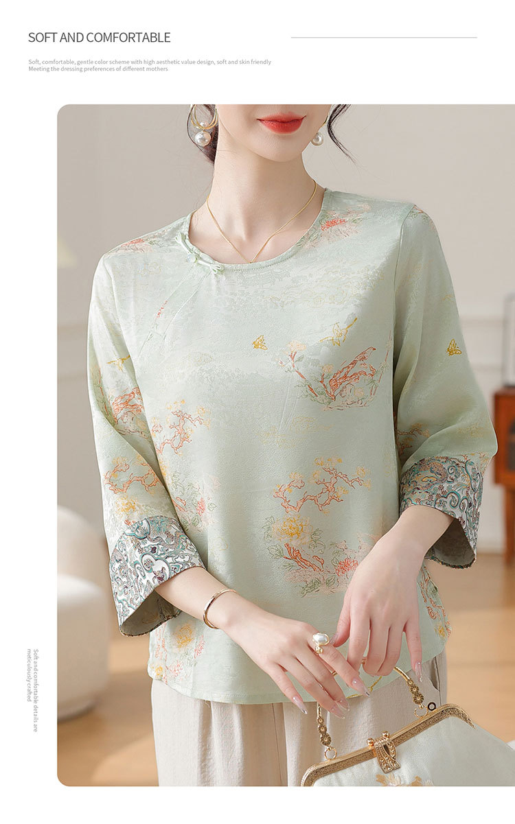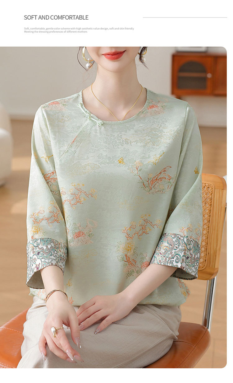 W590-SR331-75-128妈妈夏装雪纺印花中袖上衣中老年女2025新款时尚圆领T恤气质小衫