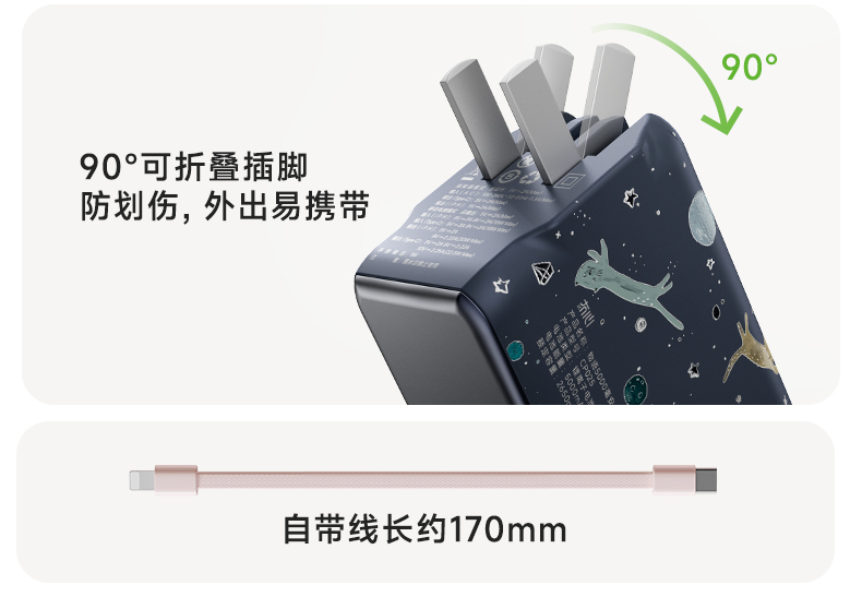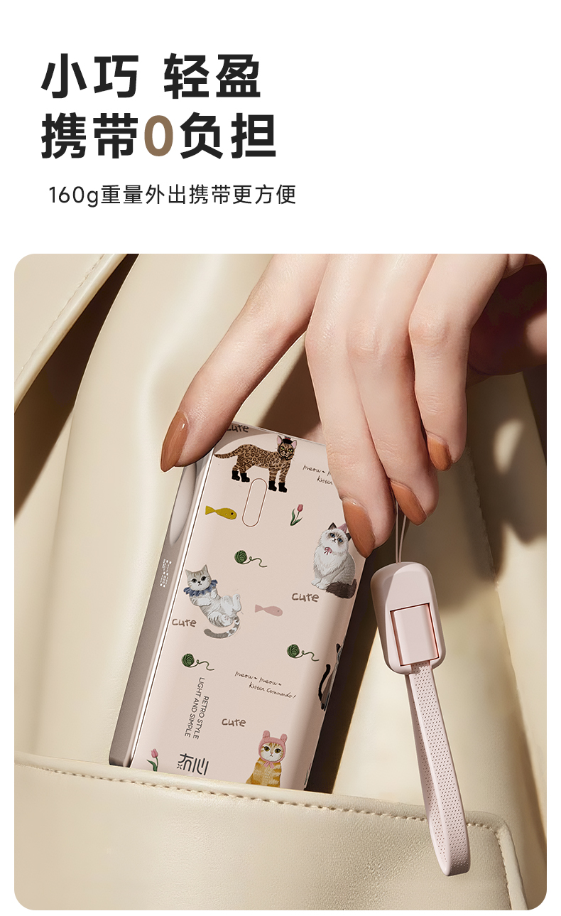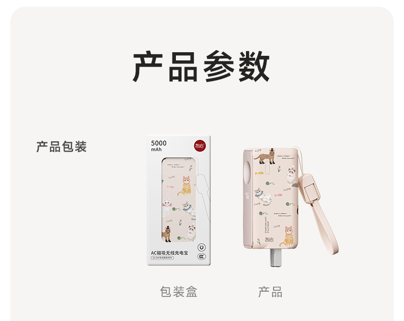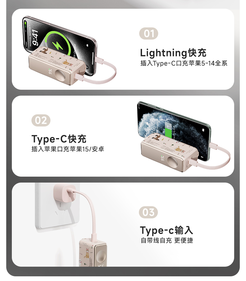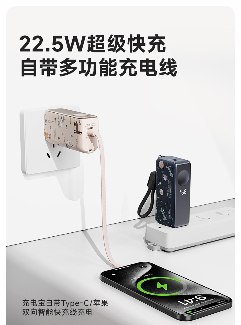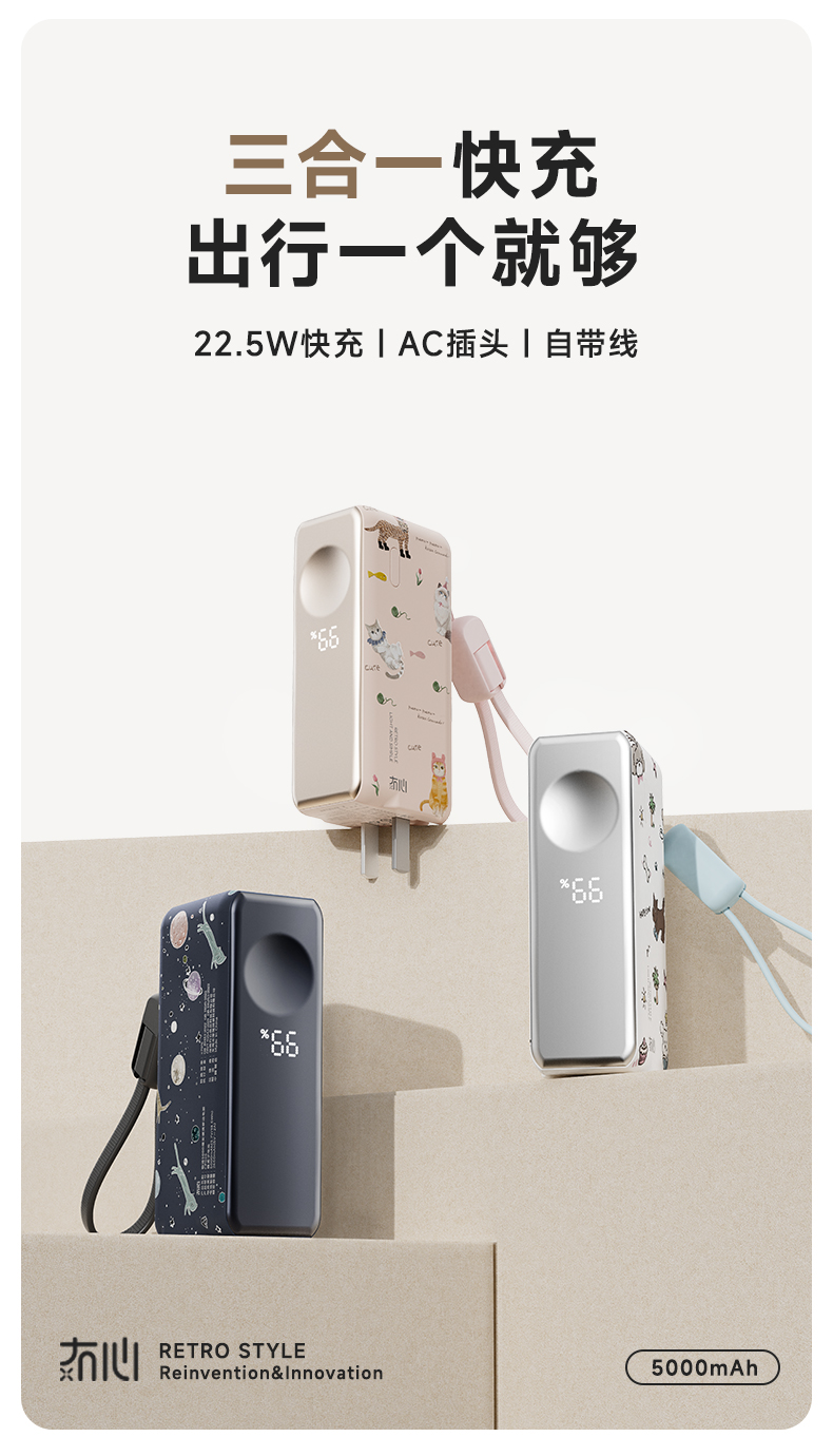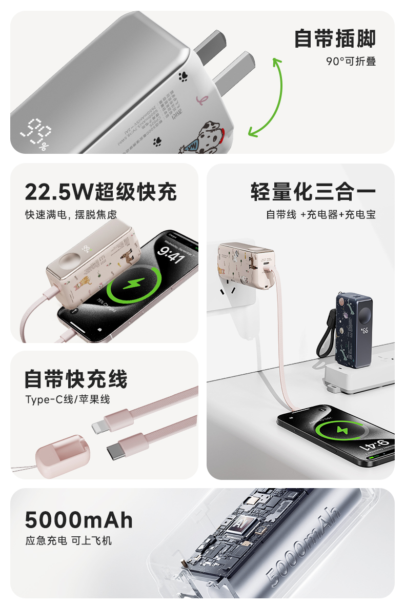 【三合一快充】冇心物语三合一充电宝CP025 可上飞机3C认证 22.5W快充 自带插脚&充电线 支持三星和苹果手表充电