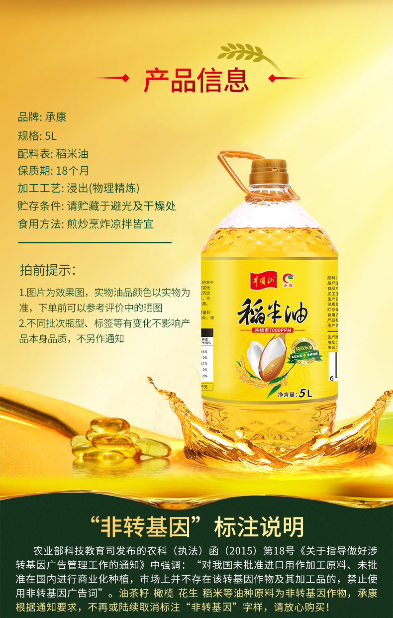 【拓高】 承康 新鲜富含谷维素纯稻米油5L【周日不发货】
