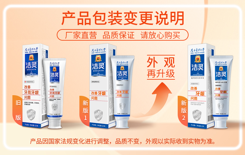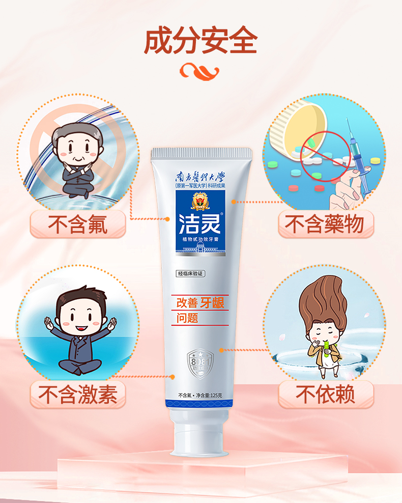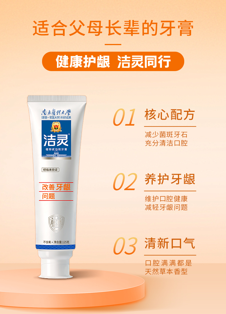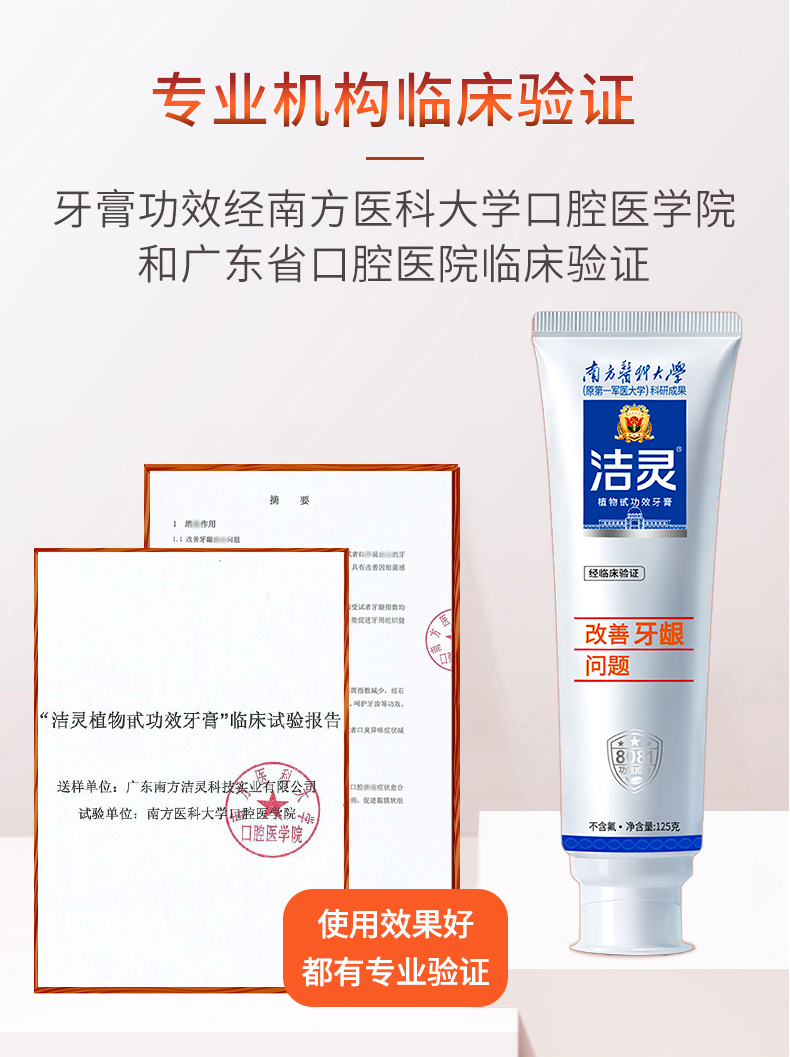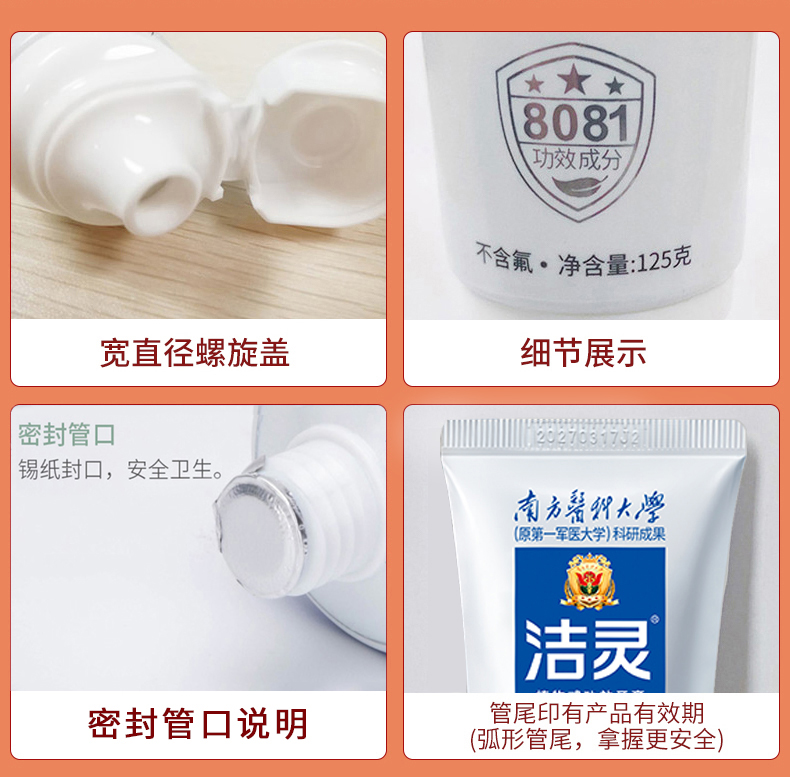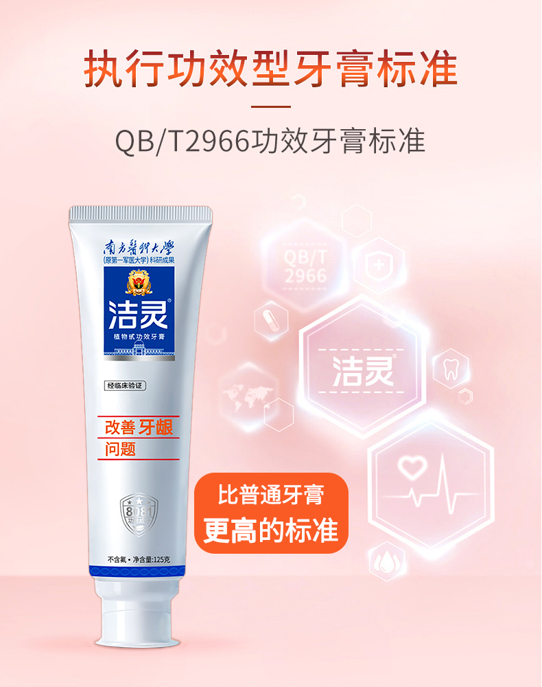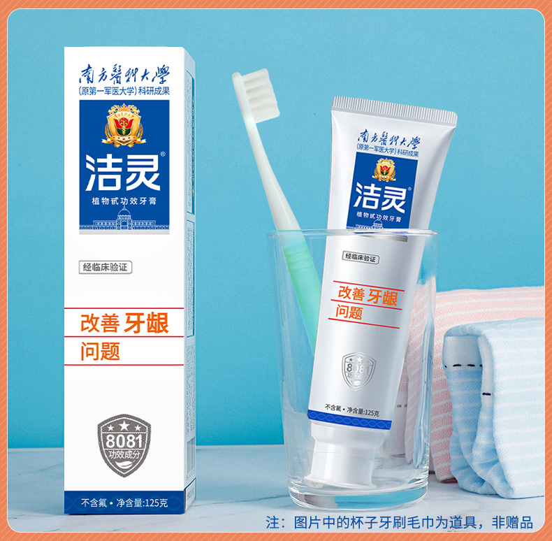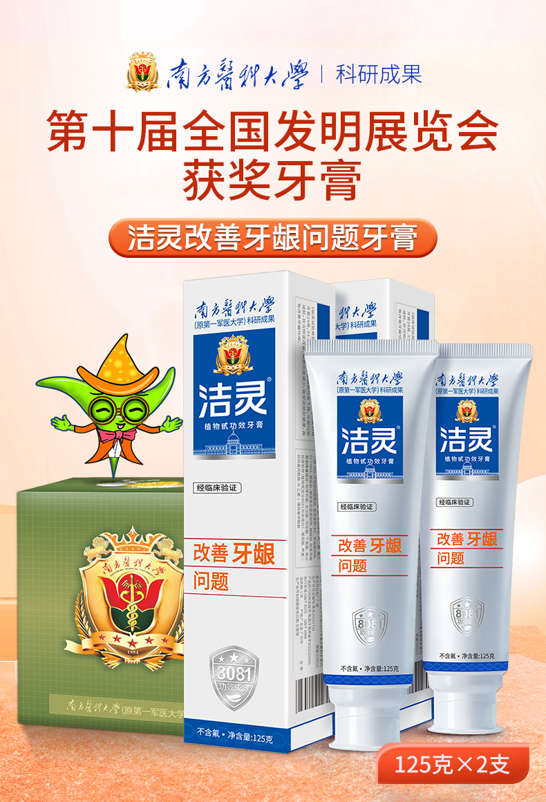 - 洁灵牙膏,由南方医科大学研制,牙膏的核心8081功效成分效果出众,在第十届全国发明展览会成为获奖牙膏。