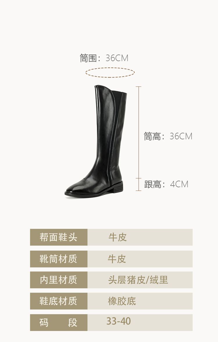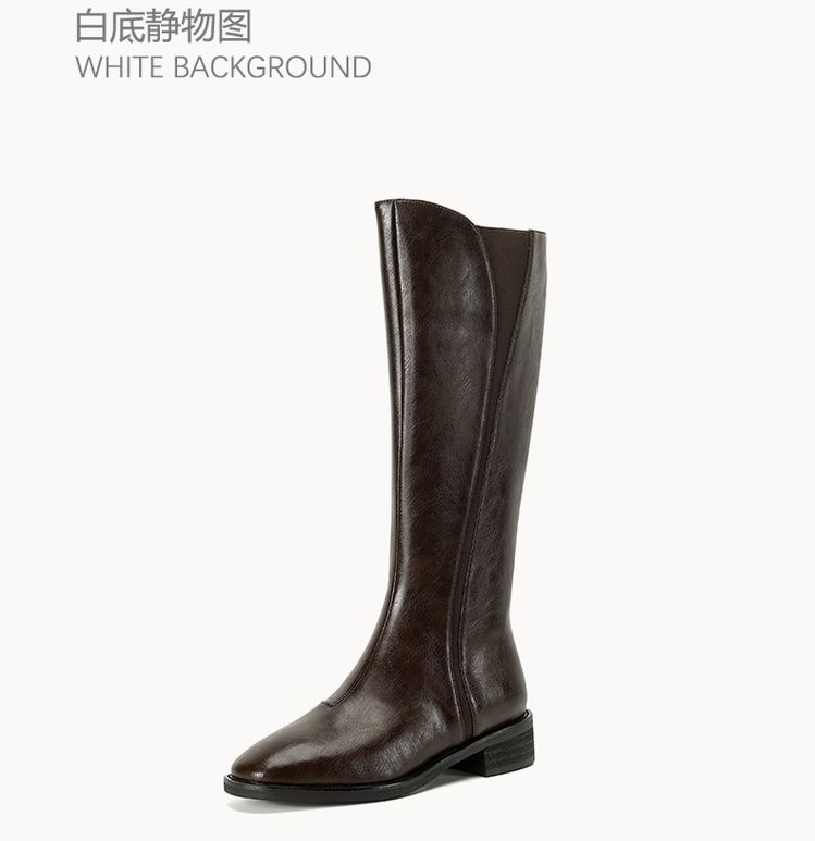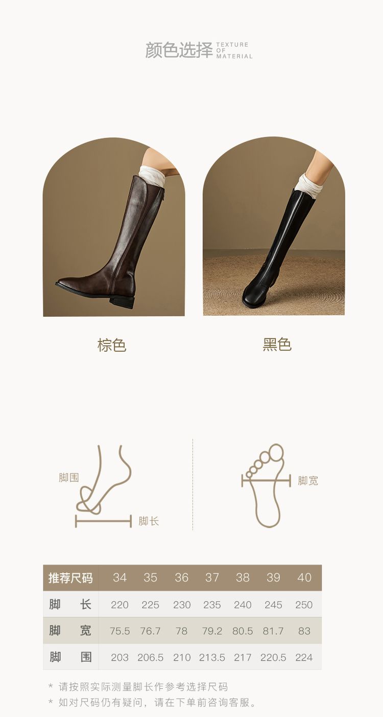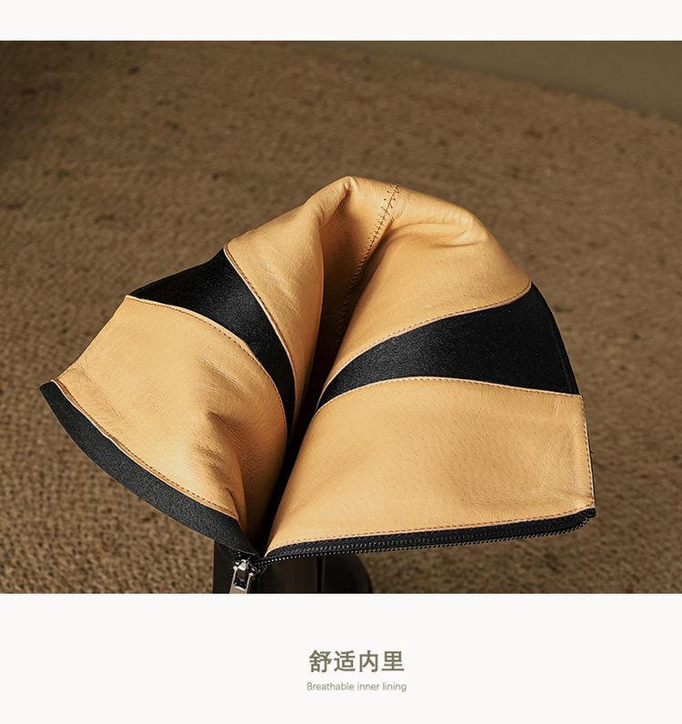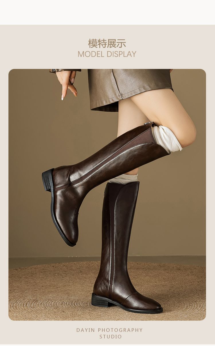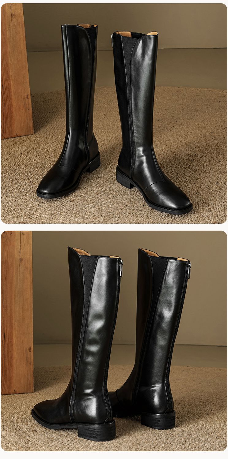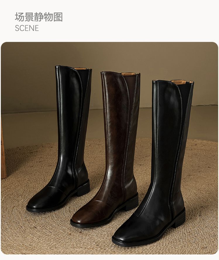 【预售7天】全牛皮拼接圆头高筒骑士靴女秋冬真皮长筒靴棕色不过膝长靴HB&9996