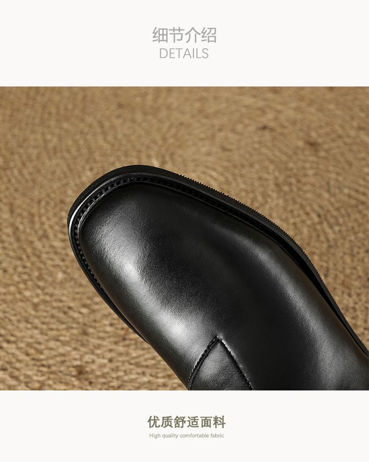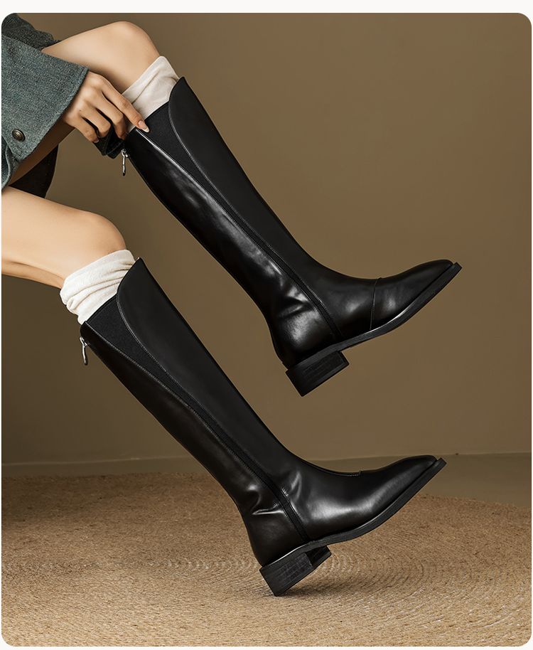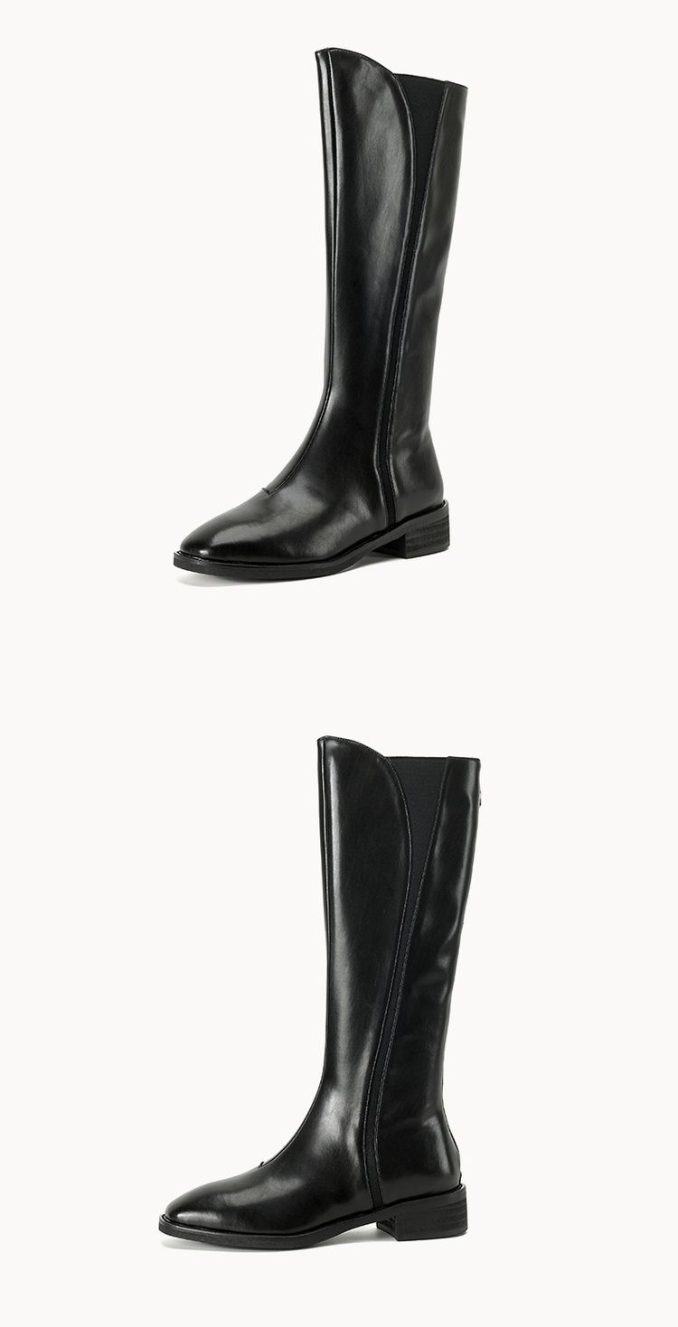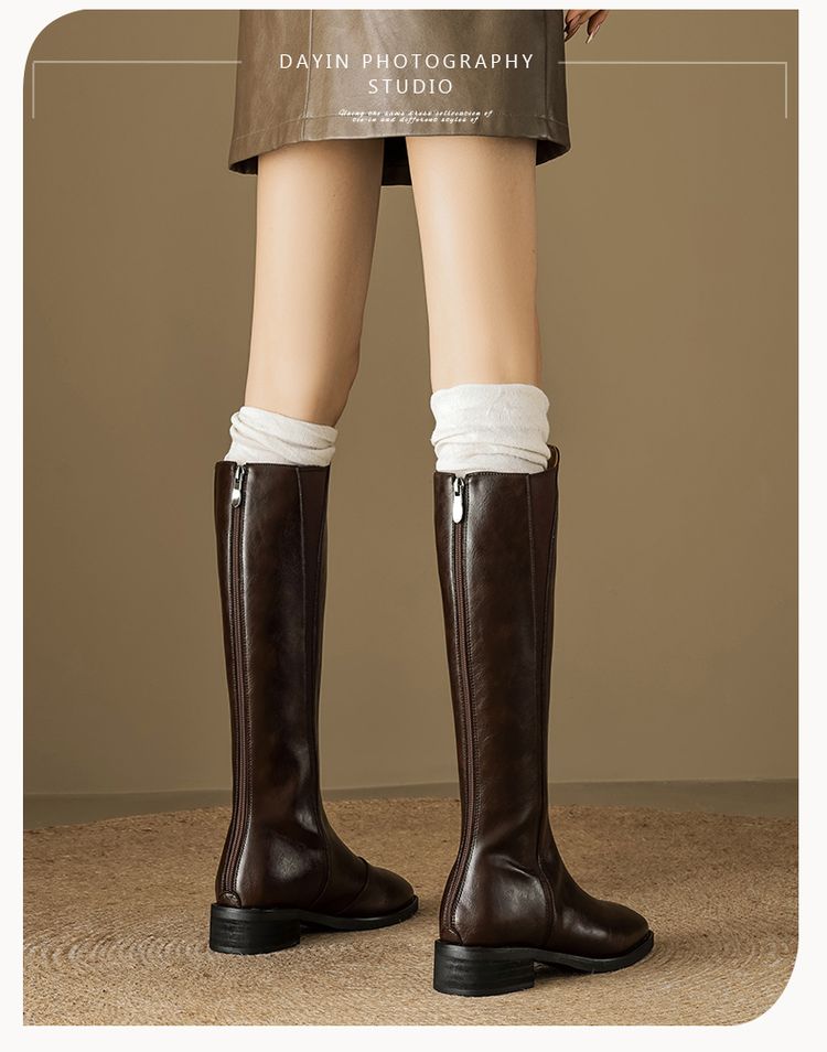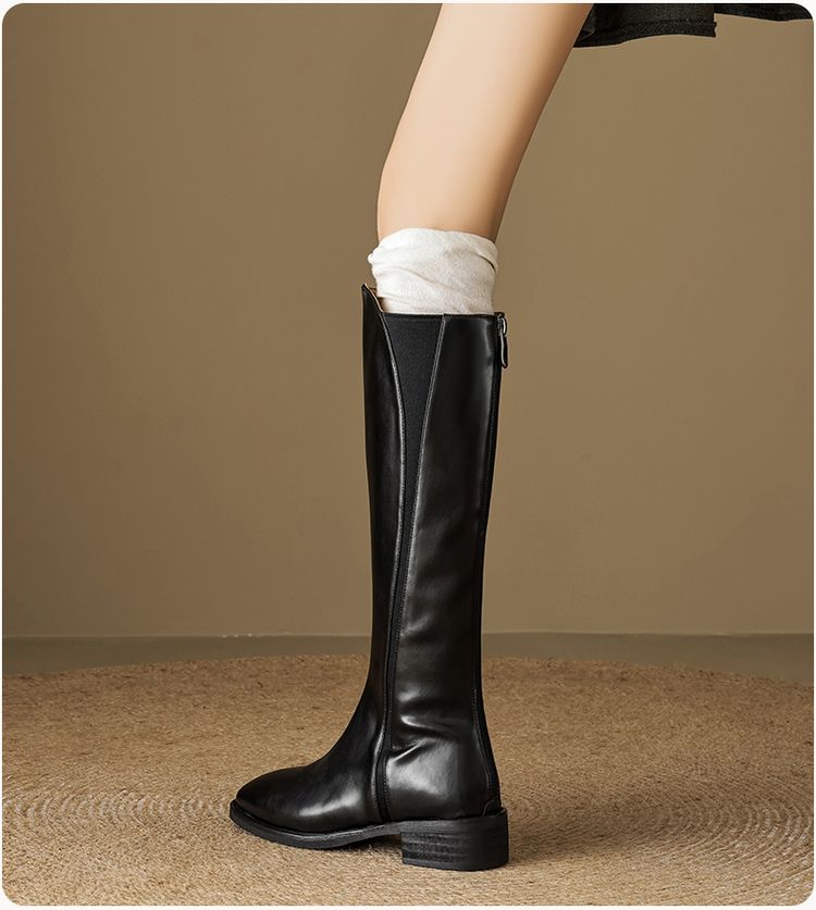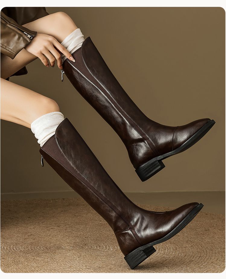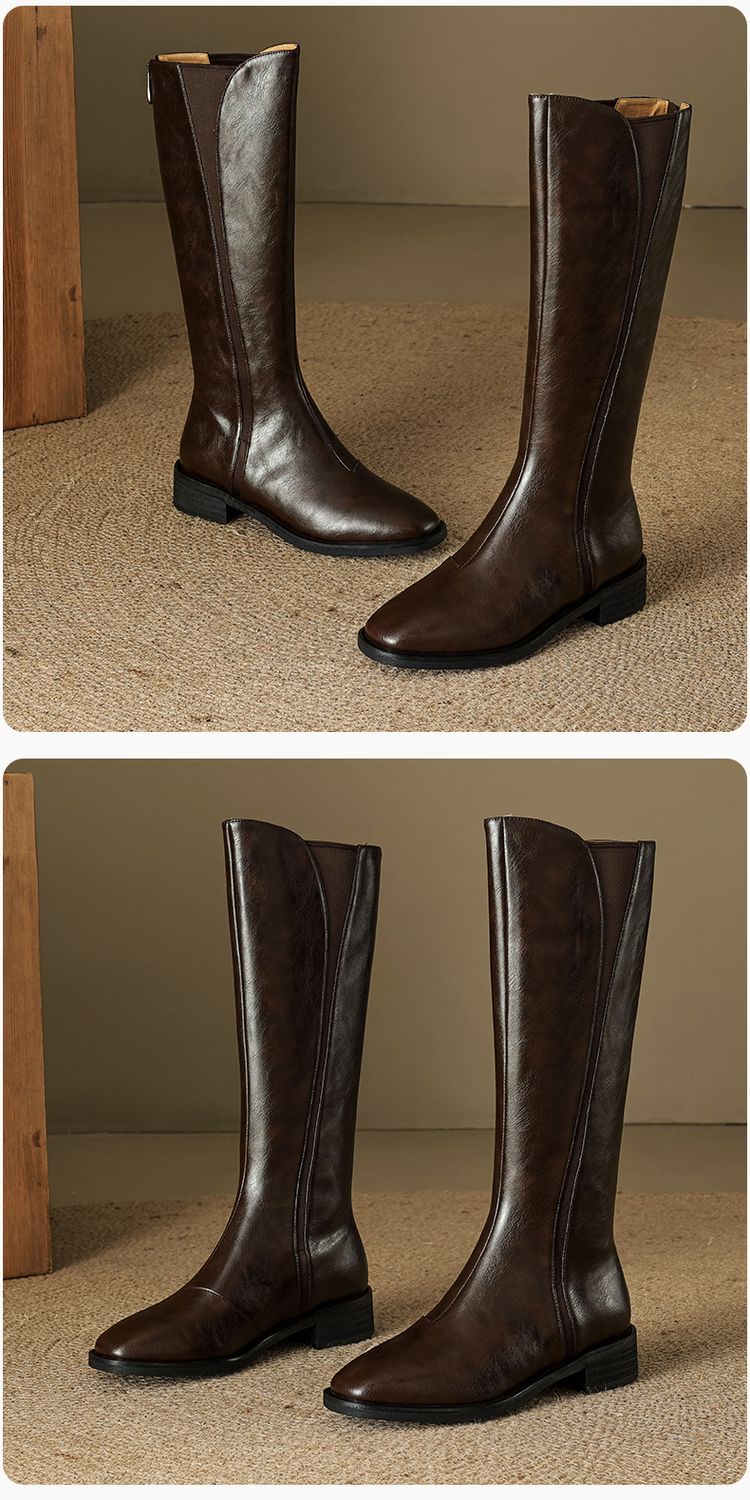 【预售7天】全牛皮拼接圆头高筒骑士靴女秋冬真皮长筒靴棕色不过膝长靴HB&9996