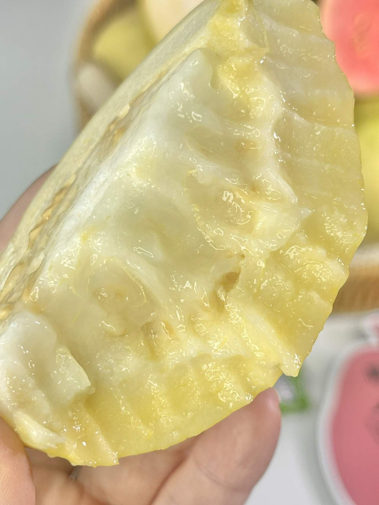 水果界的哈根达斯:一口咬下,皮脆肉甜,鼻腔里都是馥郁的香气,整个人都提神醒脑了。放软以后,果肉完全就是奶乎乎的口感,像吃奶酪一样软滑爽口,糯糯的口感让人欲罢不能。真正的皮薄肉厚,咬一口就是清晰的牙印