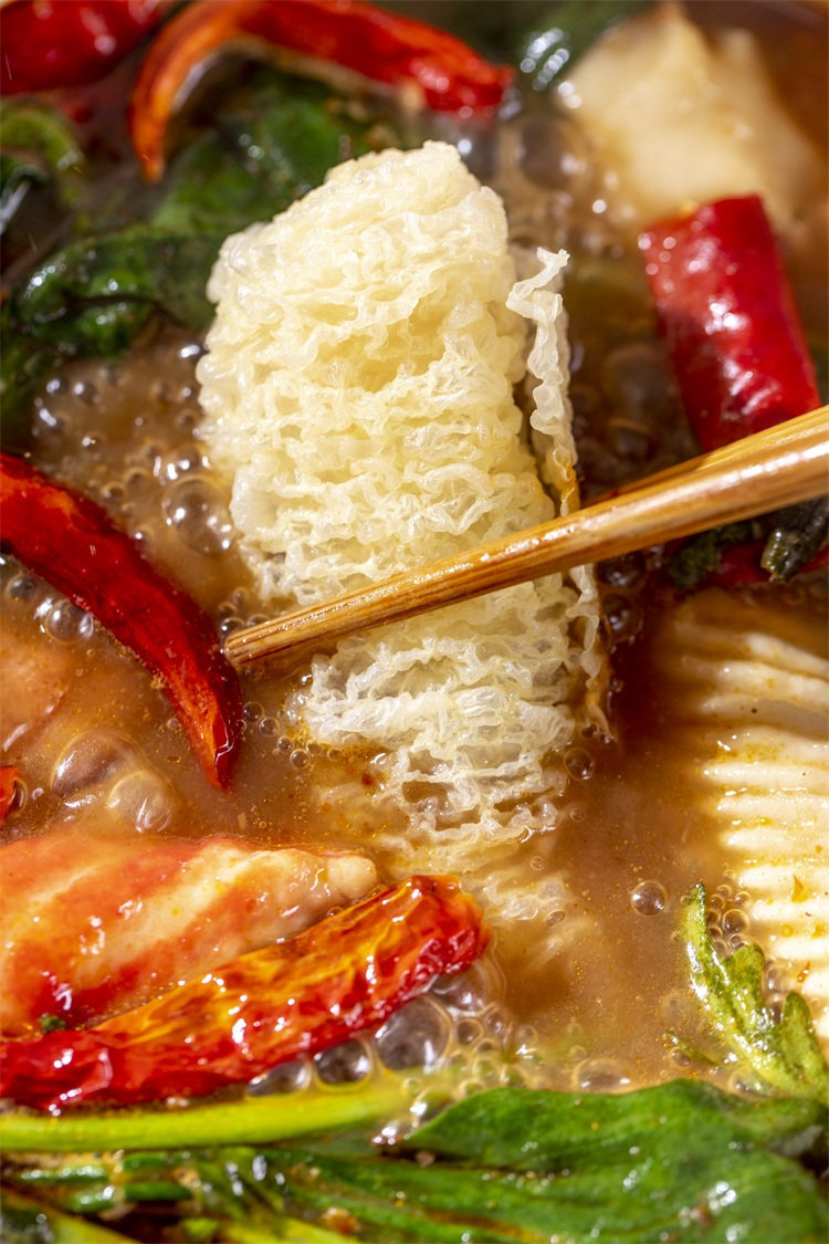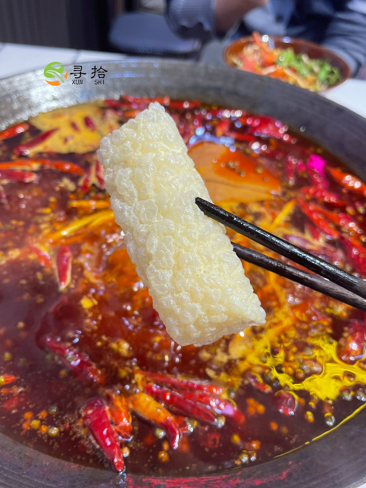 黄金豆皮卷在火锅汤底经过3秒的浸泡,软而不散,充分吸收了汤汁,一口下去,满嘴留香,最能体现出火锅的滋味。