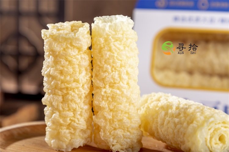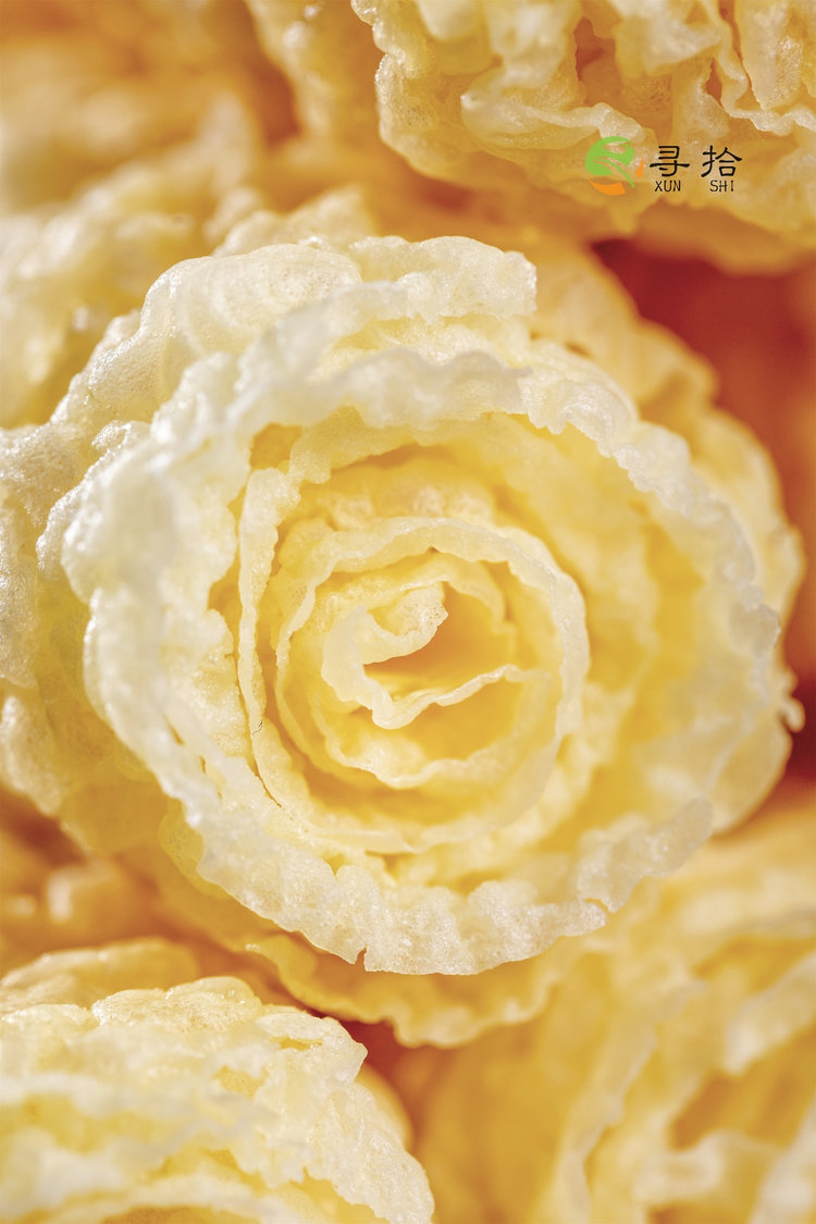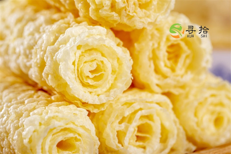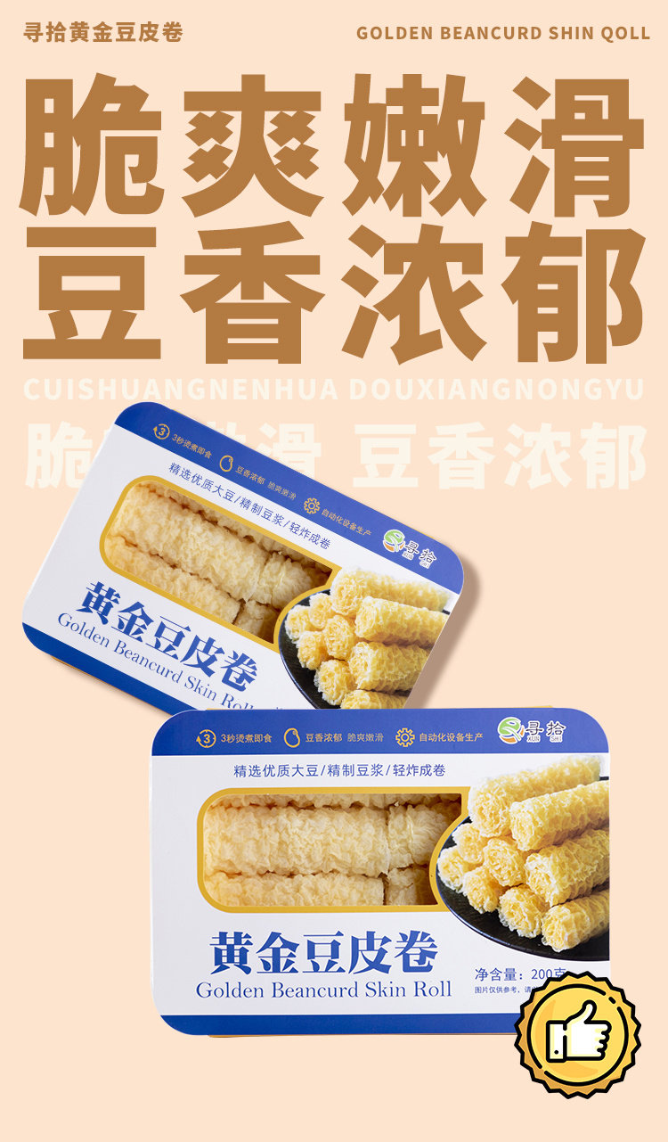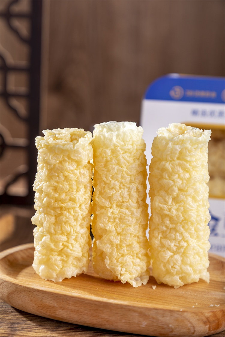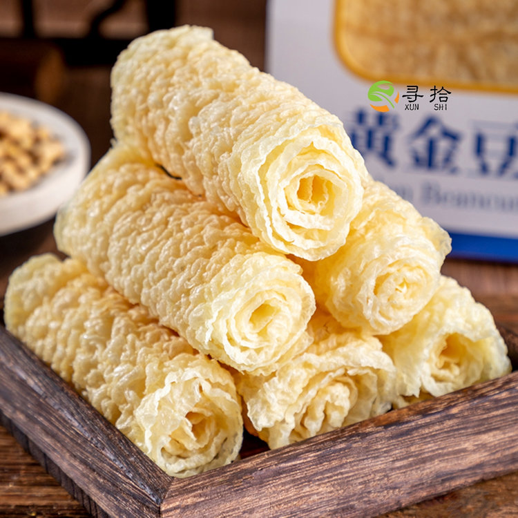 黄金豆皮卷是通过优质大豆研磨制成薄薄的豆皮再瞬间高温油炸制作出来的,每一卷都非常的轻盈酥脆。