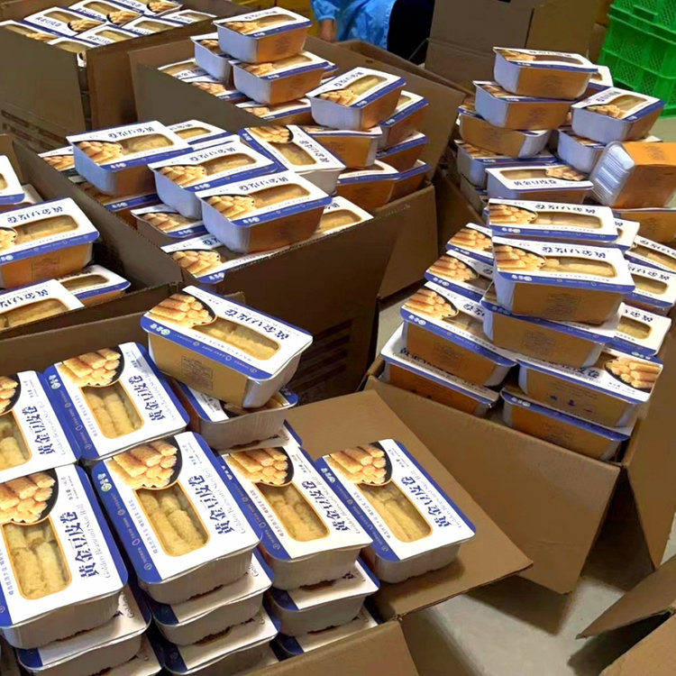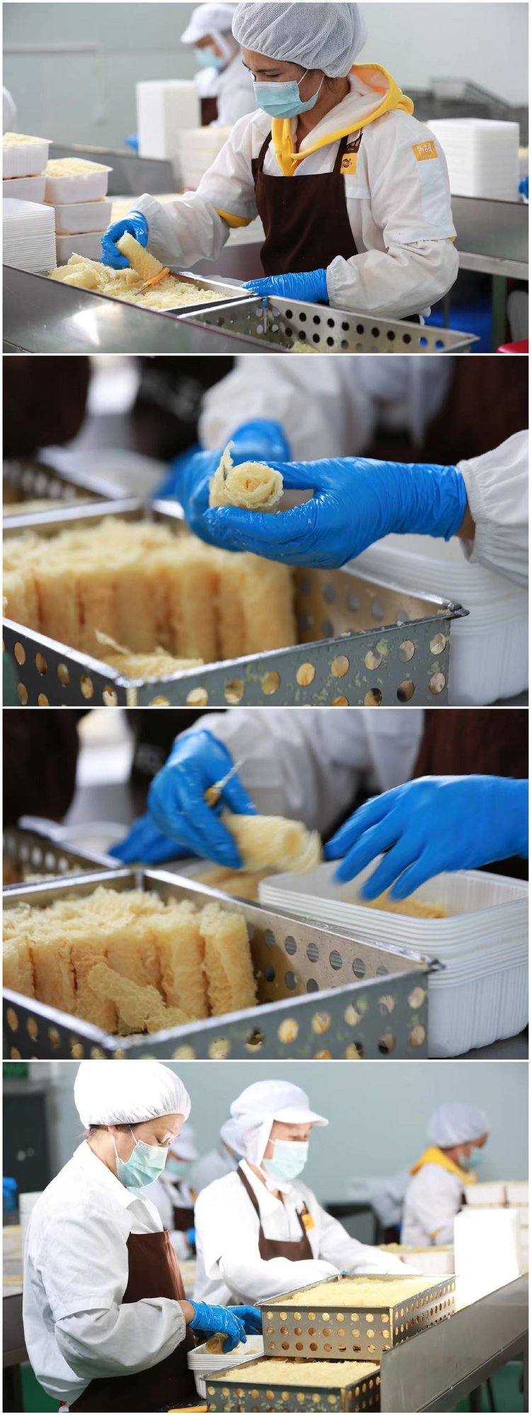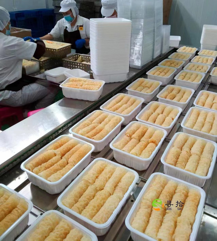 挑选出来的豆皮卷根根饱满漂亮,将其小心翼翼放入盒子,整齐排列,不易碎烂,最后封膜打包。