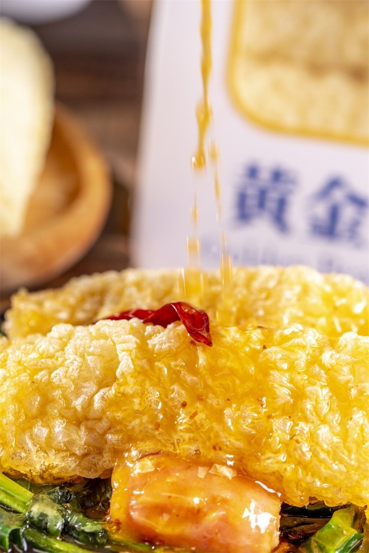 轻油炸制的黄金豆皮卷,薄脆不腻口,缝隙间汤汁保留着豆香和爽脆的口感,松脆易煮,软而不烂,细腻柔嫩。
