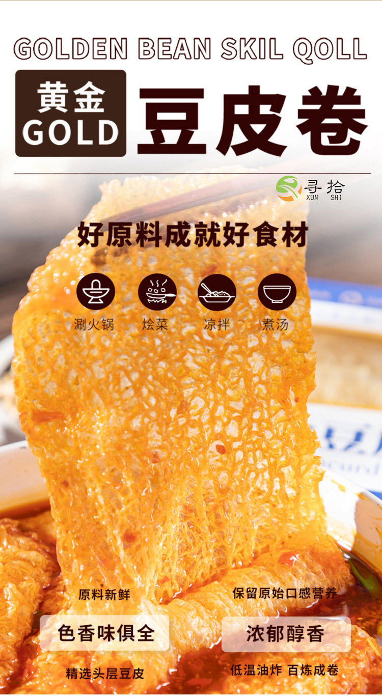 黄金豆皮卷,一口咬下去滋滋作响,脆脆酥酥的声音,所以又叫响铃卷、脆响铃、3秒铃铃卷……无须泡发,即烫即食,火锅好伴侣,粉面好搭档。