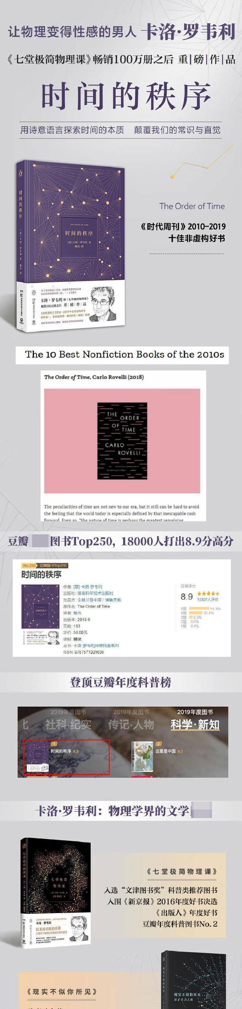 1. “让物理变得性感的男人,下一个斯蒂芬·霍金”、意大利物理学家卡洛·罗韦利《七堂极简物理课》之后重磅作品:在习以为常之处探索世界的惊人真相,用诗意语言探索时间的本质 2. 坂本龙一盛赞,卷福倾情朗读,有声书屡获大奖,《时代周刊》2010—2019十佳非虚构好书 3. 口碑超高的诗意科普,豆瓣Top250图书,18000人打出8.9分高分!湖南大学校长送给2020级新生的入学礼物 4. 精美装帧,优雅开本,精致烫金,延续《七堂极简物理课》的唯美设计