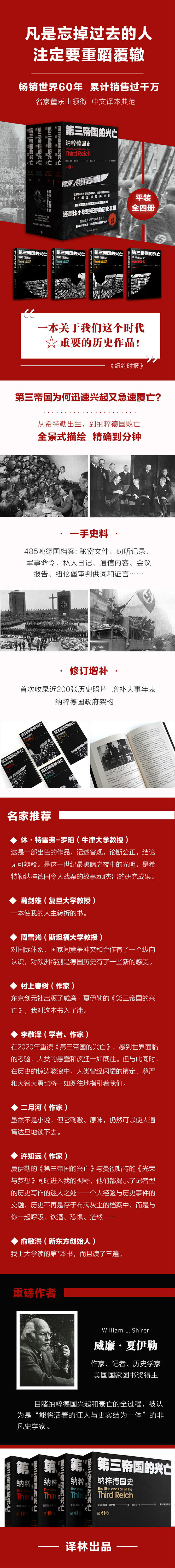 2020年,在世界反法西斯战役胜利75周年、《第三帝国的兴亡》中文版出版55周年之际,译林出版社推出四册修订版,主要包含以下三个方面:Di一,对照英文原版重新校订译文,针对全书三千多条人名、地名,按照通行的译名法则进行修订;第二,补充近200张珍贵历史照片,图文对应,全景式展现真实的历史场景;第三,编写大事年表、德国政府架构,为阅读增加辅助资料。