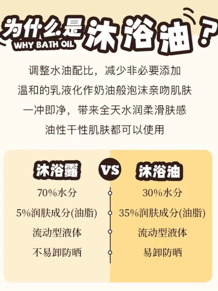 ✅沐浴油主要成分是油脂,如天然植物油,它清洁力相对温和,能滋润皮肤,在皮肤表面形成保护膜,防止水分流失。质地比较油腻,冲洗后皮肤滋润、光滑 ,类似于脸部卸妆油一样用完皮肤不会干巴巴的,反而还能更润呼一点