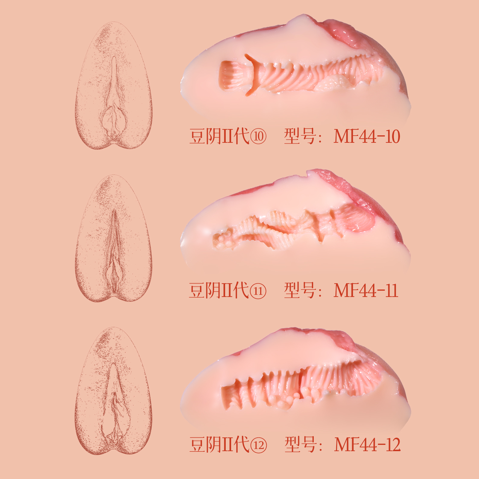 漫渺豆阴二代系列⑩⑪⑫三款Dou-Shaped Pussy 豆形の女性陰部シリーズ 콩형의 여성 음부 시리즈 Bộ sưu tập âm hộ nữ Bean Shape 本系列为收藏不同外形阴部 逼真美阴 可插通道 进口原料 豆阴II代⑩ 型号:MF44-10 条码:6973736552997 规格:13*7cm 重量:293g 通道深9cm【产品名称】漫渺豆阴II代⑩【型号】MF44-10【产品材质】SRFS【规格尺寸】13*7cm【颜色】肉色【净重】293g【主要功能】男士解压(带通道)或收藏【保质期】24个月【生产日期】见包装【品牌名称】ManMiao漫渺【品牌商】上海漫渺国际贸易有限公司【执行标准】Q/MMBJ 002-2017【质检标准】GB/T 22048-2008 GB6675.4-2014 GB 4706.1-2005合格【气味】无香型【保存条件】置阴凉干燥处保存【使用方法】见视频【注意事项】1、本产品为成人用品,严禁未成年人使用 2、产品忌高温且易燃,应远离火源与高温 3、考虑个人卫生问题,使用前后需清洗。——————————————————————————————————————豆阴II代⑪ 型号:MF44-11 条码:6973736553000 规格:13*7cm 重量:294g 通道深9cm【产品名称】漫渺豆阴II代⑪【型号】MF44-11【产品材质】SRFS【规格尺寸】13*7cm【颜色】肉色【净重】294g【主要功能】男士解压(带通道)或收藏【保质期】24个月【生产日期】见包装【品牌名称】ManMiao漫渺【品牌商】上海漫渺国际贸易有限公司【执行标准】Q/MMBJ 002-2017【质检标准】GB/T 22048-2008 GB6675.4-2014 GB 4706.1-2005合格【气味】无香型【保存条件】置阴凉干燥处保存【使用方法】见视频【注意事项】1、本产品为成人用品,严禁未成年人使用 2、产品忌高温且易燃,应远离火源与高温 3、考虑个人卫生问题,使用前后需清洗。——————————————————————————————————————豆阴II代⑫ 型号:MF44-12 条码:6973736553017 规格:13*7cm 重量:289g 通道深9cm【产品名称】漫渺豆阴II代⑫【型号】MF44-12【产品材质】SRFS【规格尺寸】13*7cm【颜色】肉色【净重】289g【主要功能】男士解压(带通道)或收藏【保质期】24个月【生产日期】见包装【品牌名称】ManMiao漫渺【品牌商】上海漫渺国际贸易有限公司【执行标准】Q/MMBJ 002-2017【质检标准】GB/T 22048-2008 GB6675.4-2014 GB 4706.1-2005合格【气味】无香型【保存条件】置阴凉干燥处保存【使用方法】见视频【注意事项】1、本产品为成人用品,严禁未成年人使用 2、产品忌高温且易燃,应远离火源与高温 3、考虑个人卫生问题,使用前后需清洗。