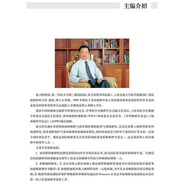 俞卫锋教授为上海交通大学医学院附属仁济医院麻醉科主任,主任医师、教授、博导。长期从事肝胆疾病的麻醉与围术期处理的临床与基础研究,尤其是在吸入麻醉药肝毒性机理研究、围术期肝保护与黄疸麻醉的基础临床研究、癌性疼痛的信号转导与基因治疗等方面一直处于国际领先水平。现在是国际麻醉界具有重要影响的著名肝胆麻醉专家之一,也是我国和上海市麻醉学的领军人之一。共培养硕士生48名,博士生35名,承担超过23项的自然科学基金科研任务,主编专著5部。共发表论文205篇,SCI收录58篇,总影响因子超过150分,单篇6.186分。