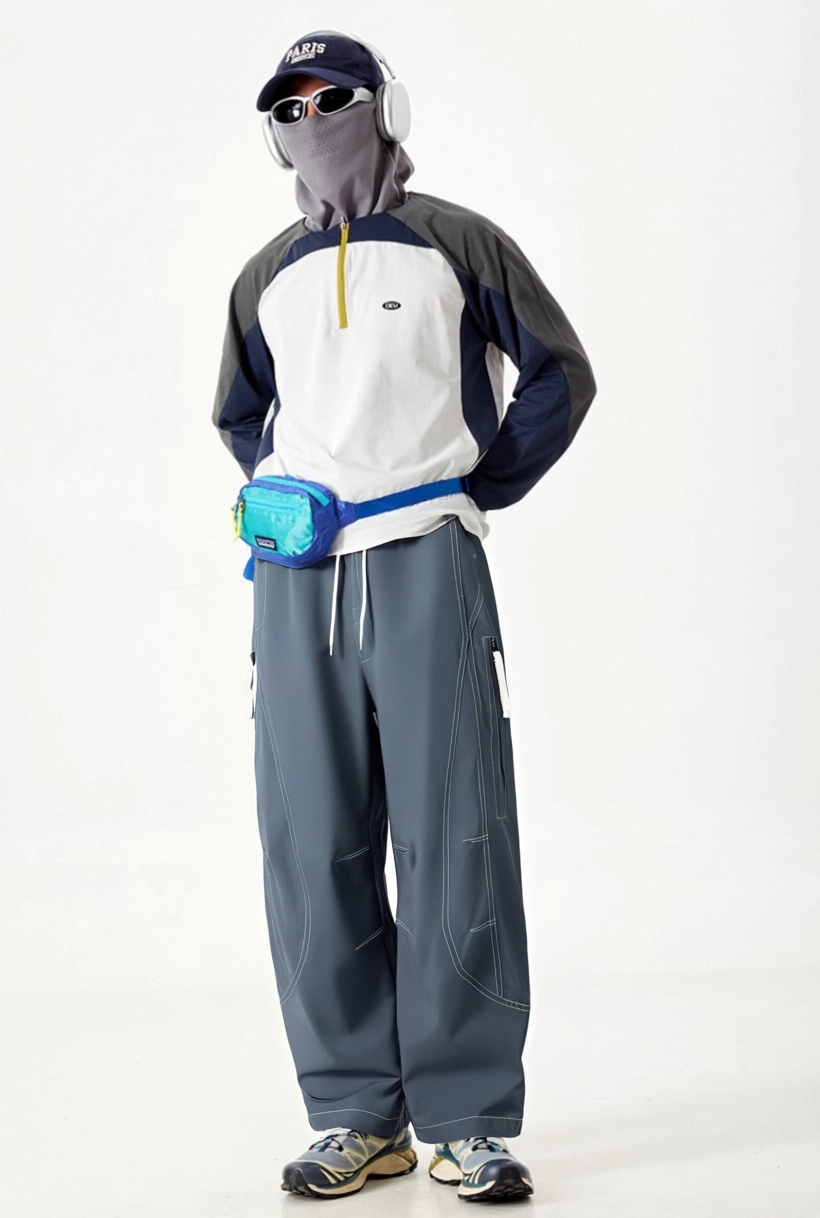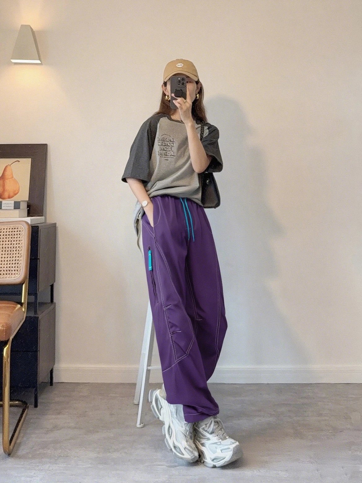是简单的直筒宽松版型+简约松紧小高腰版型