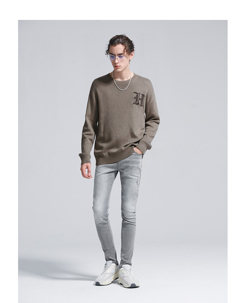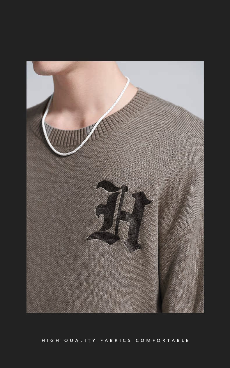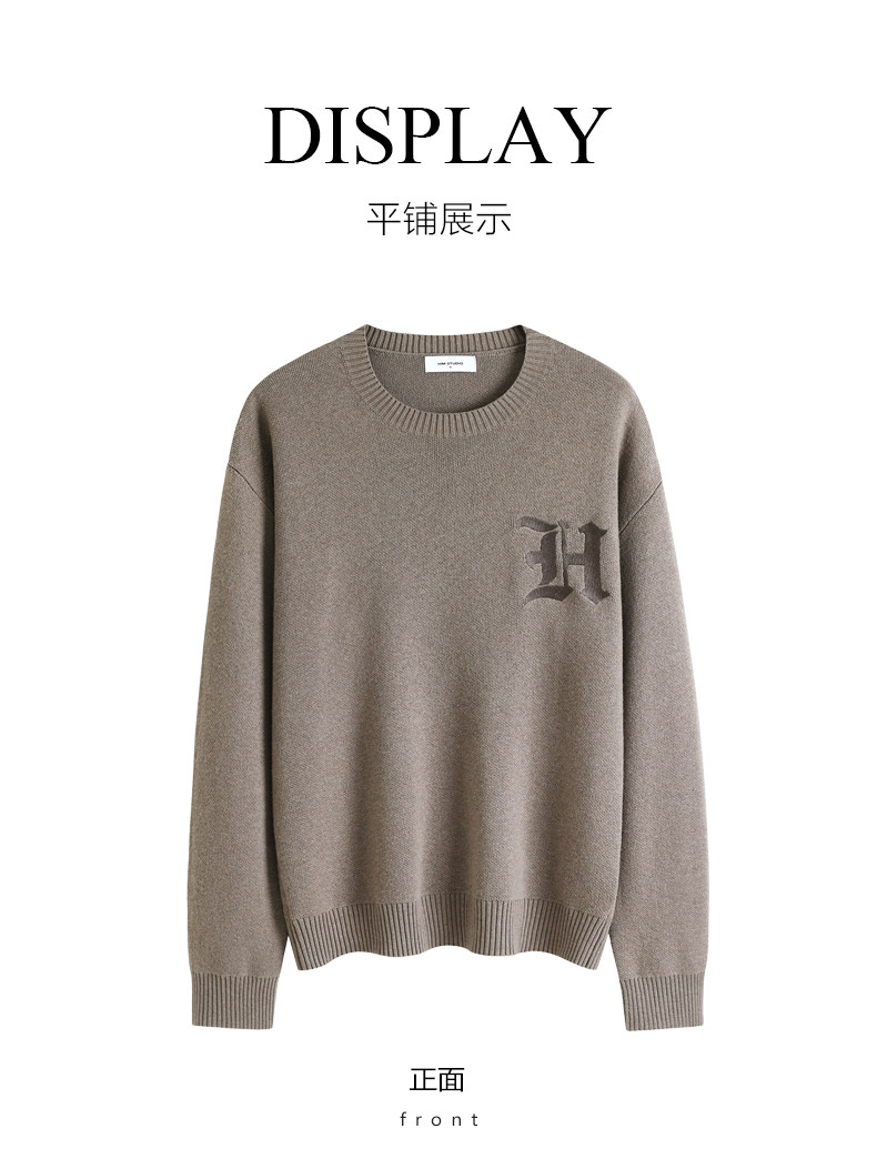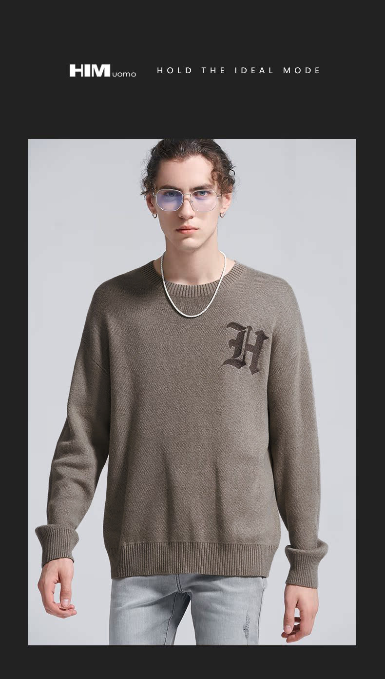 HIM漢崇 字母刺绣圆领毛衣男宽松保暖百搭长袖套头线衫 2024冬季