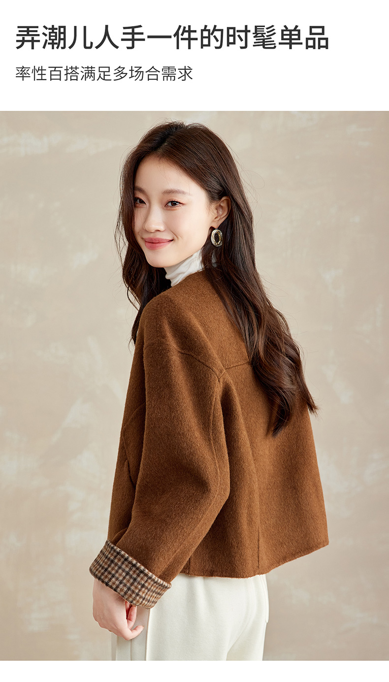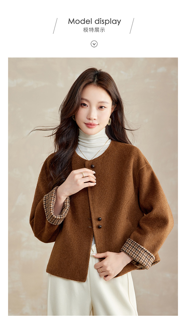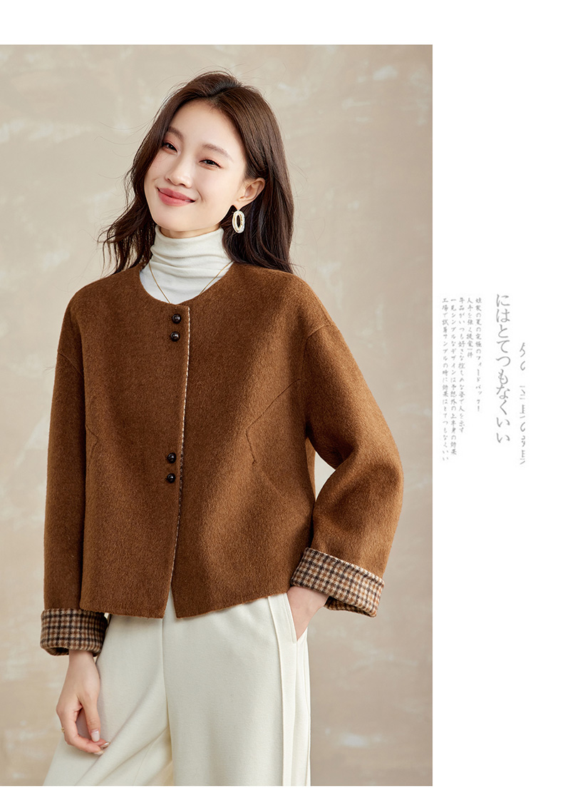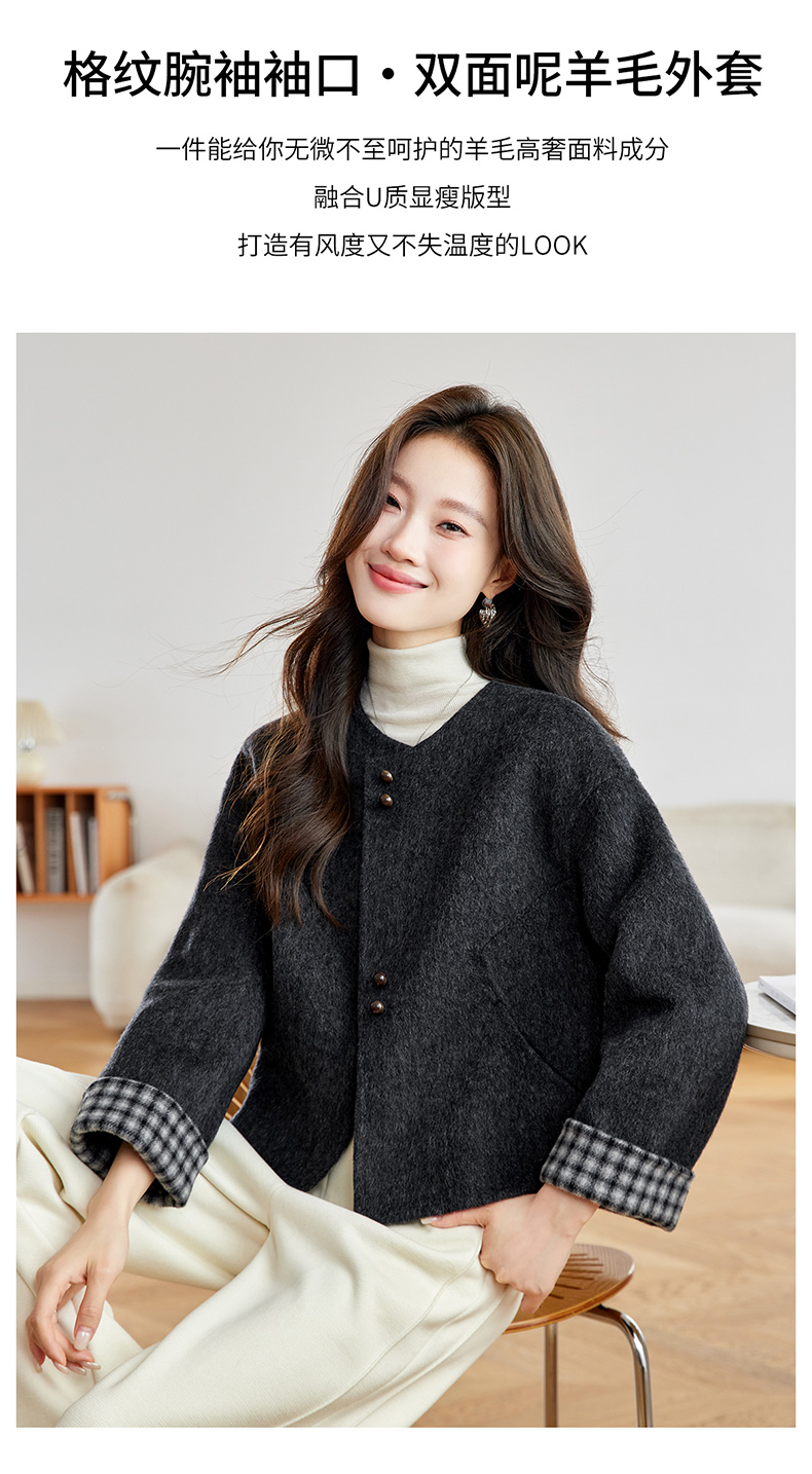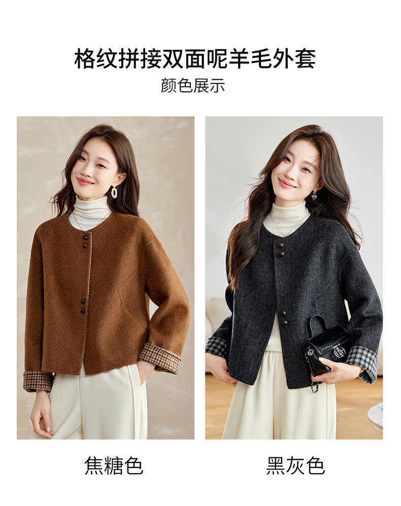 短款双面羊毛大衣,气质格纹拼接百搭显瘦毛呢外套HR-SHIY2620