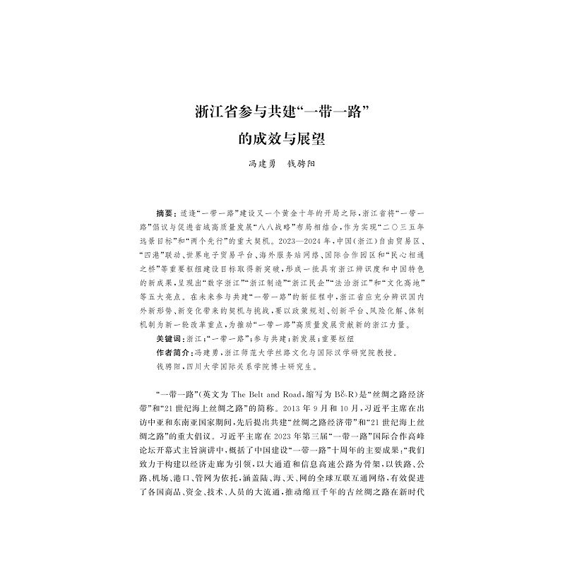 一带一路”倡议以来,浙江省参与“一带一路”建设,全力打造“一带一路”战略枢纽,形成参与国际竞争与合作的新优势,“一带一路”建设排头兵作用突显,形成了一批具有浙江辨识度和中国气派的“一带一路”重大标志性成果,在实施新一轮“一带一路”建设中,浙江充分认识国内外新形势新变化带来的机遇和挑战,进一步推动重大政策、重大项目、重大平台、风险控制机制、工作机制等创新,为推动共建“一带一路”高质量发展贡献新的浙江力量。2023-2024年,在实施“一带一路”战略的全球布局当中,浙江积极与“一带一路”沿线国家合作,与中东欧、阿拉伯国家、东南亚、非洲等地区的国别与区域切实推进合作建设,双方合作进一步取得新的重要进展。